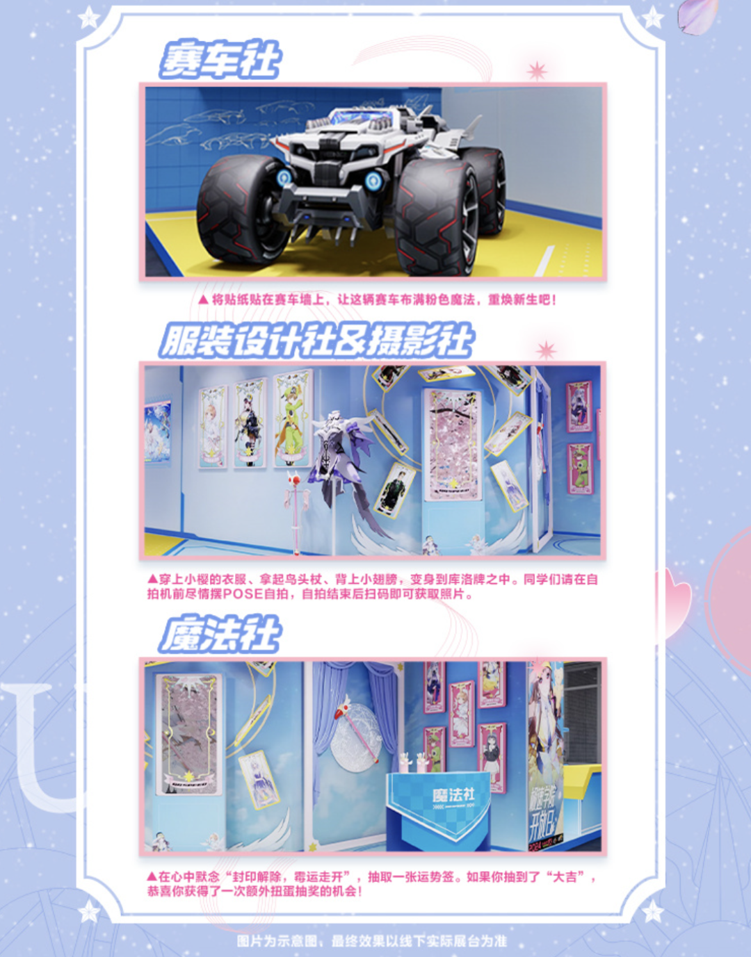 车手们可以在赛车社脑洞大开,使用贴纸贴出你的创意咕车~还有服装设计社&摄影社梦幻值拉满,拍出与众不同的精美照片!最最神秘的魔法社也招新啦,默念咒语,用魔法来占卜吧~快来参与吧!