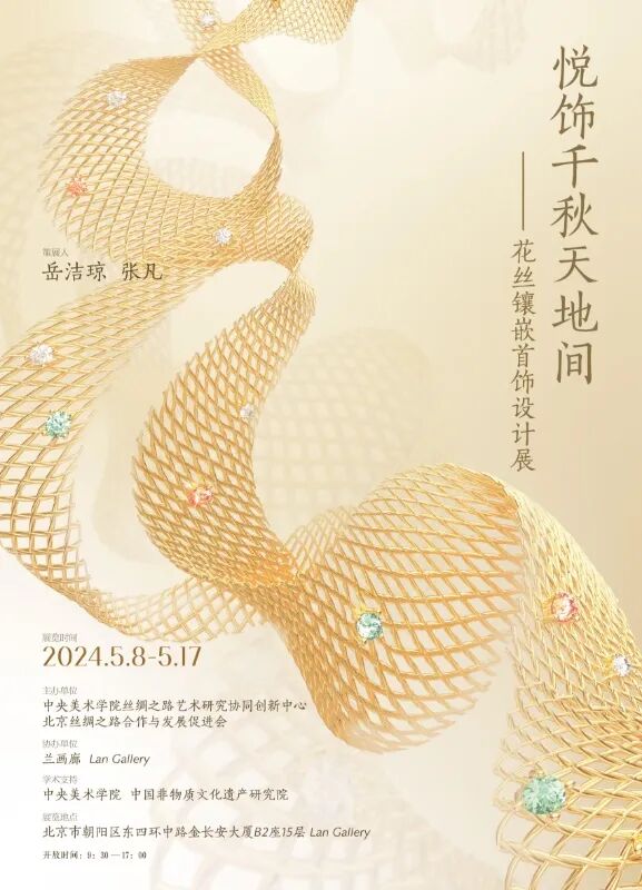 “悦饰”系列花丝镶嵌首饰设计展首展——“悦饰千秋天地间——花丝镶嵌首饰设计展”将于2024年5月8日下午2点在北京兰画廊开幕。展览由中央美术学院丝绸之路艺术研究协同创新中心、北京丝绸之路合作与发展促进会主办,旨在服务北京作为国际文化中心、 国际交往中心重要职能,于北京这座历史文化名城推出创新文化领域内的优秀青年首饰设计师,打造系列特色首饰专题展览品牌,同时,进一步推动设计创新优秀艺术作品的传播交流与推广,使其发挥引导和示范作用。
