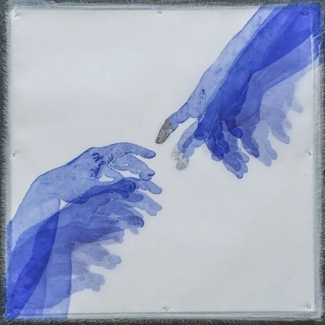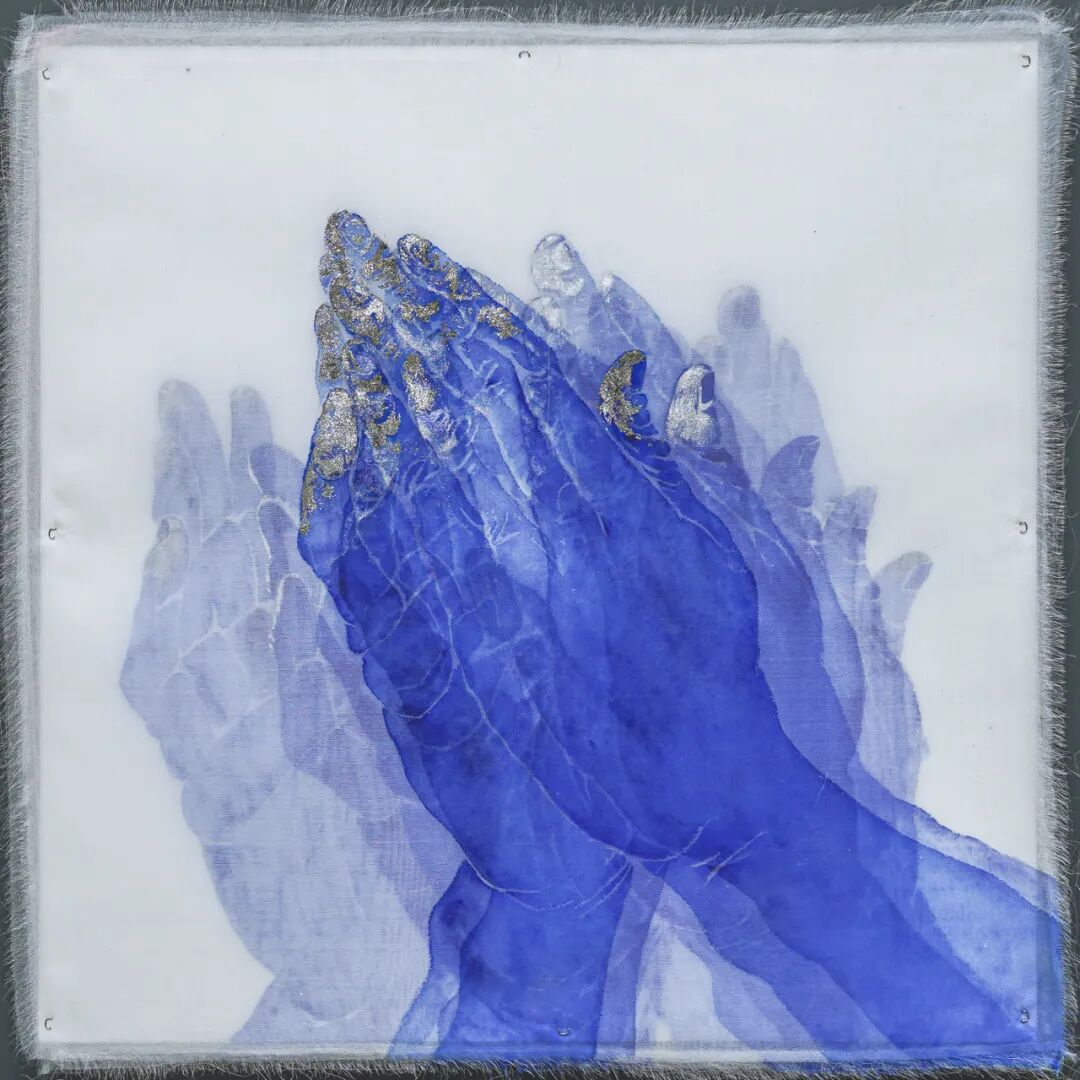 轻薄的绢本与水性颜料绘画的层层透叠,将平面的图形切片化,使得这系列作品呈现出一种空间纵深感和时间厚度。这批同质材料语言的绘画指向了两个方向:一个是沿着个体的日常经验,将生存的深刻感知忠实记录。如同《散光》系列源自艺术家的儿时经历,自小高度散光的她一直生活在一个模糊而充满光晕的世界中,这个不甚清晰的眼前之景却正是一个“散光者”所接触到的全部真实。从2017年开始,沈采试着用创作的方式还原这个光晕笼罩的世界,一层一层地在绢制底板上切割出时间的观念,一个运动的视觉状态。大学时代深读让·鲍德里亚(Jean Baudrillard)的“拟像理论”让沈采意识到,对眼前所见世界真实性的困惑从来不是她一个人的故事,对真实与想象、现实与幻觉、存在与缺席的关照一直伴随着每一个人类自身。新作《飞矢不动》延续了这一创作动机,“飞矢不动”中的“矢”指弓箭中的“箭”,离弦之箭在空中的每一个瞬间,都是“静止”的,而观看连续瞬间所连接的那一条线,又是“运动”的。不论是被艺术史之中某个经典手势击中的瞬间,还是双手捧住脸颊抑或双手交叉于胸前的瞬间,沈采想表达的都是对世界虚幻又真实、运动又静止的一种体认。