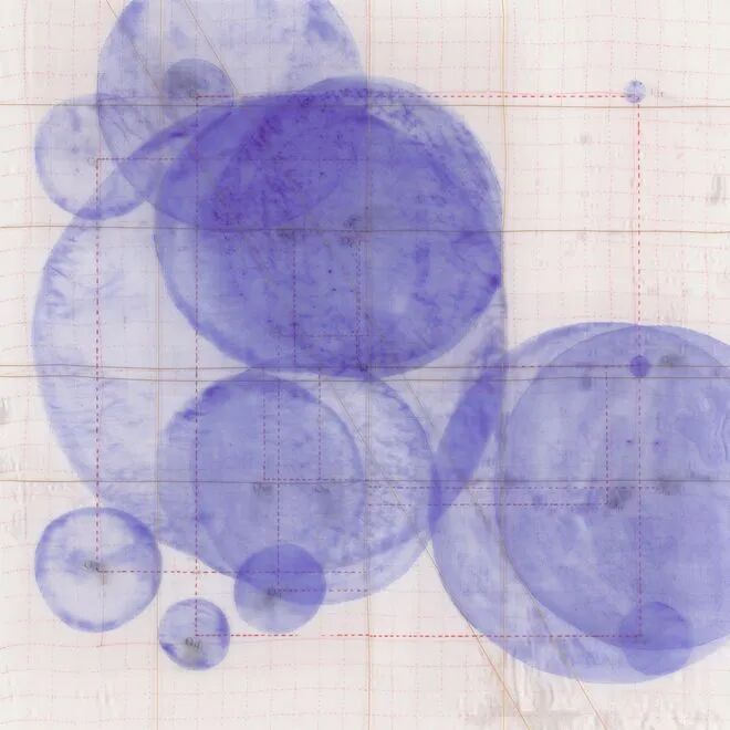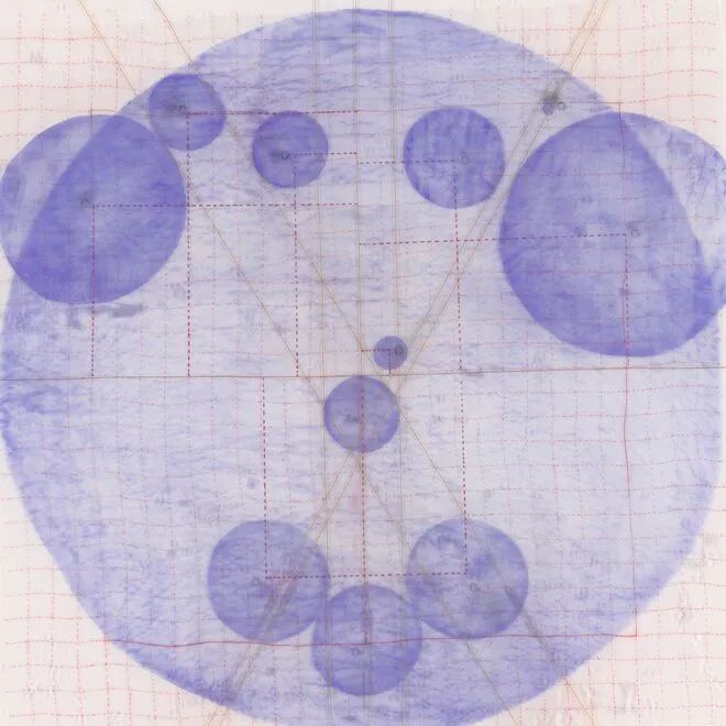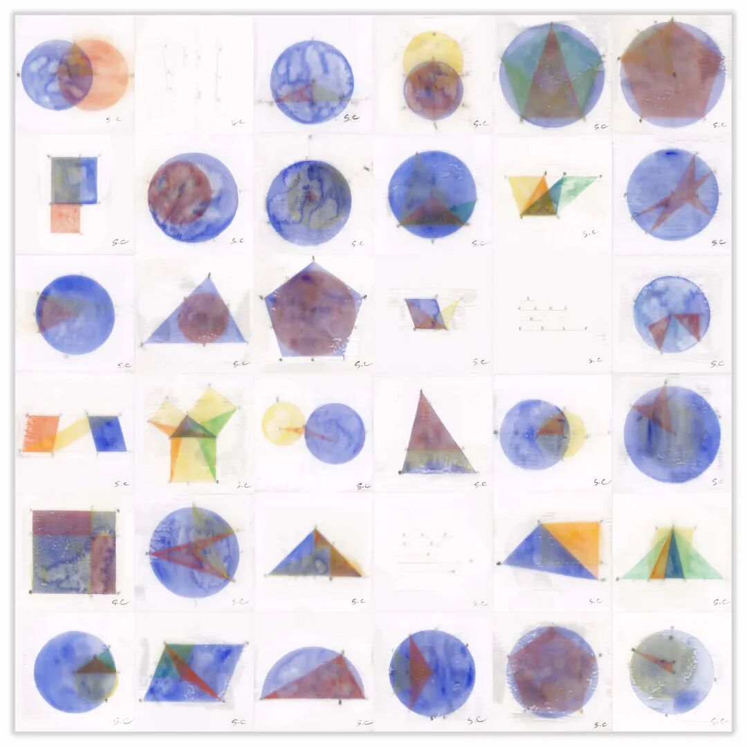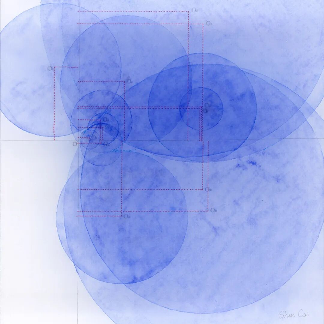 另一个方向,则是《code》、《Ideal-eye》、《几何原本》系列作品所展现出来的,基于数学思维对现实世界的一种剖析。作品中既包含了理性的数字计算公式,也保留了有温度的人工制作痕迹。现代计算机的编程思维来源于织布机的花纹编织,因而丝绸中的理性逻辑和作品里的几何计算之间也存在着潜在的关联。正方形、圆形、三角形……世界万物皆是由这些基本的几何图形构筑而成,画面中图形与图形之间的交织和碰撞经过仔细的运算,展现出一种理性之美。通过手绘的方法来绘制计算机制图,以这样的行动反思了当下人与机器、技术、科技的关系。这样的思路,在沈采最新创作的空间装置《mTagBFP2的云》中亦是如出一辙。