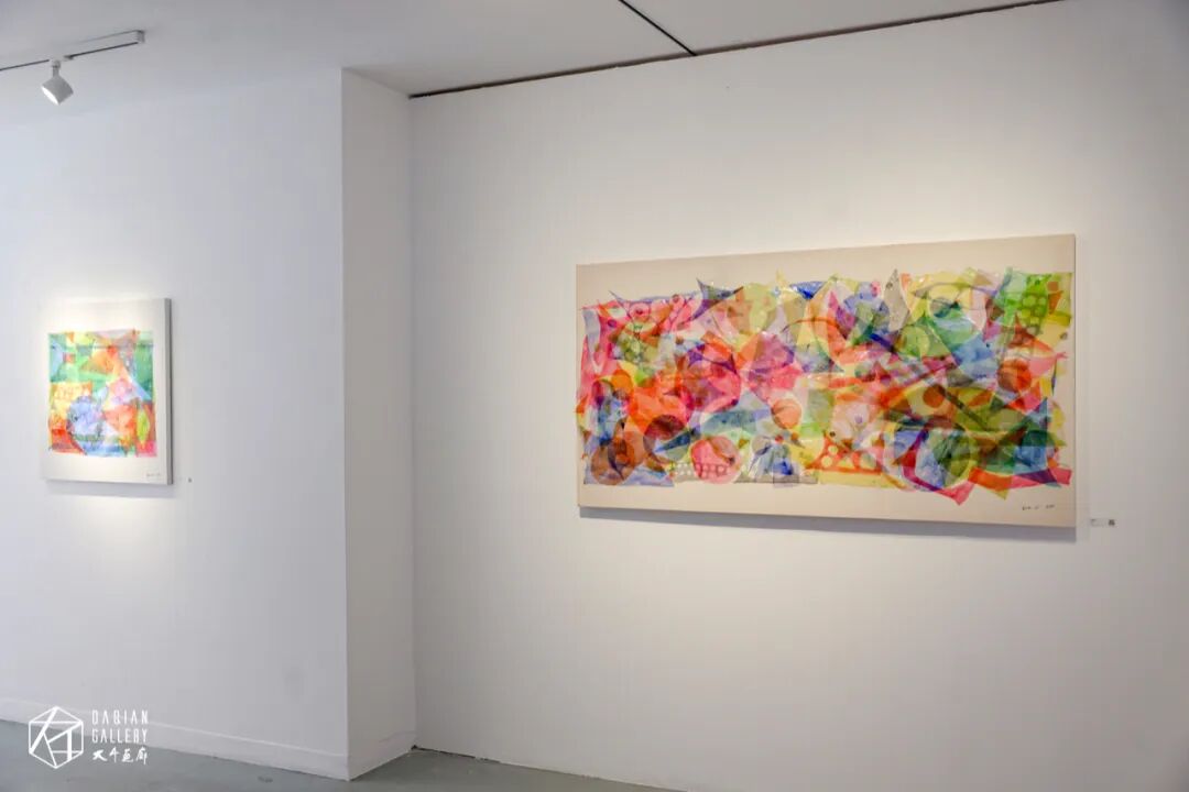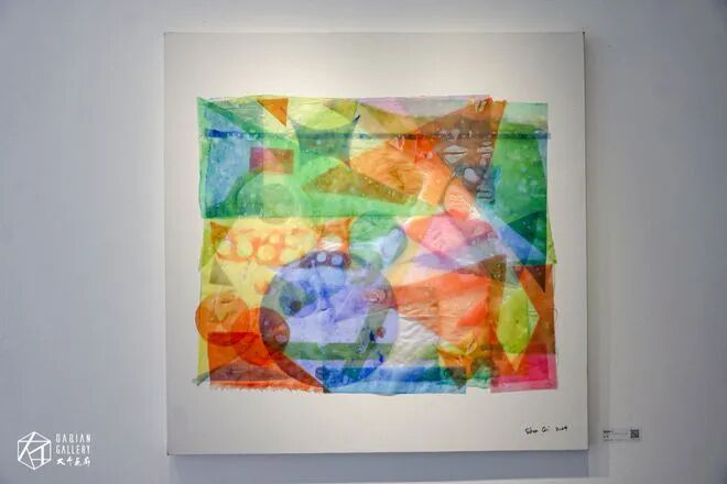 在展览中,我们还看到了一些小型的综合材料作品《几何原本》,运用了多种材料进行创作,在谈到创作材料时,沈采表示:“我使用中国传统材料比较多,如丝绸、水彩、国画颜料等。像这幅作品它是在多层的丝绸上面用水彩颜料和国画颜料进行层层叠加的形式,然后还用了双层的亚克力以及一些丙烯颜料等,最终呈现出这种独特的视觉效果,这也是一种综合材料类的创作。其实,我的创作并没有局限于某一特定的材料,而是会根据创作需求和材料的特性进行灵活运用”。