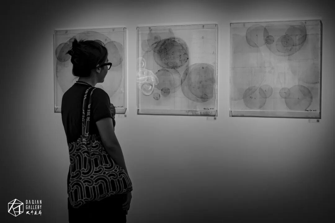本次展览的主题为“光晕”,而沈采的作品中也出现了许多圆形元素。她解释道:“这些圆形并非刻意为了符合主题而设计,而是源于数学定理。世界上所有的弧度都是圆的一部分,就像我的这幅作品《理想之眼》,我们眼睛看到的每一道这样的曲线,都是来自于圆形的一部分,但是当我用手把这样的一个通过眼睛看到正圆画出来的时候,它肯定是有一定的偏差的,而不像机器所画出来的正圆一样完美,这种偏差就像理想和现实之间存在的偏差感一样,是有距离的。