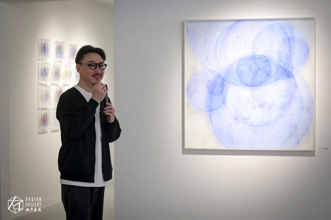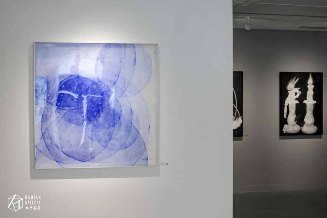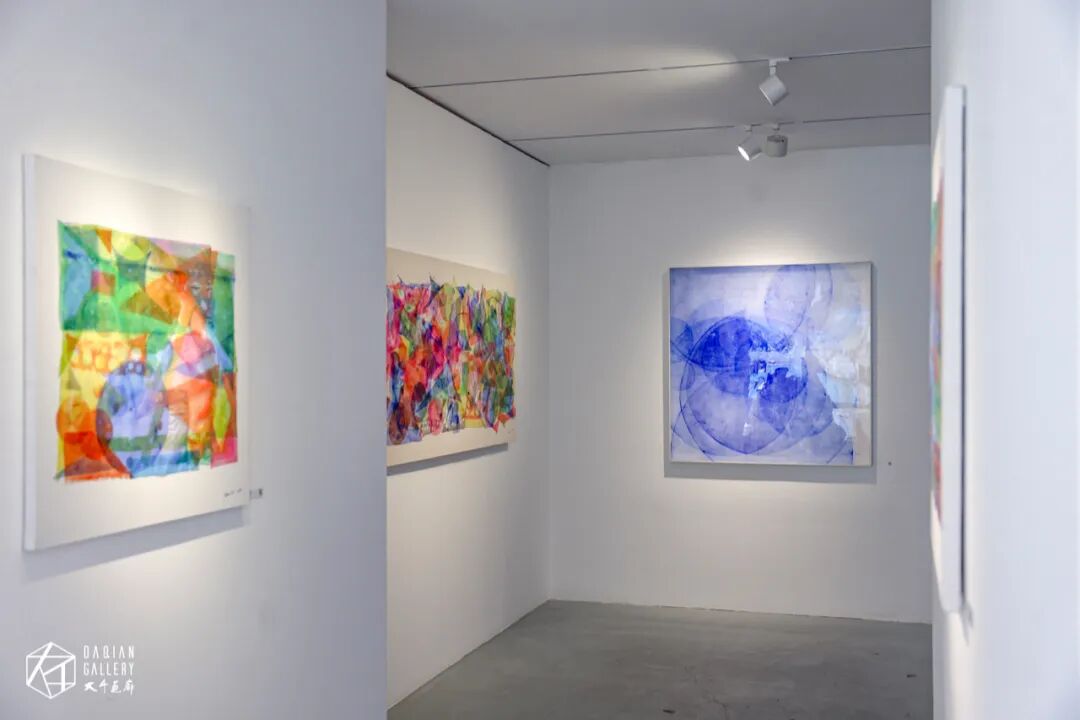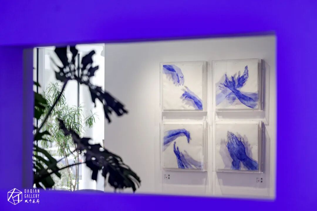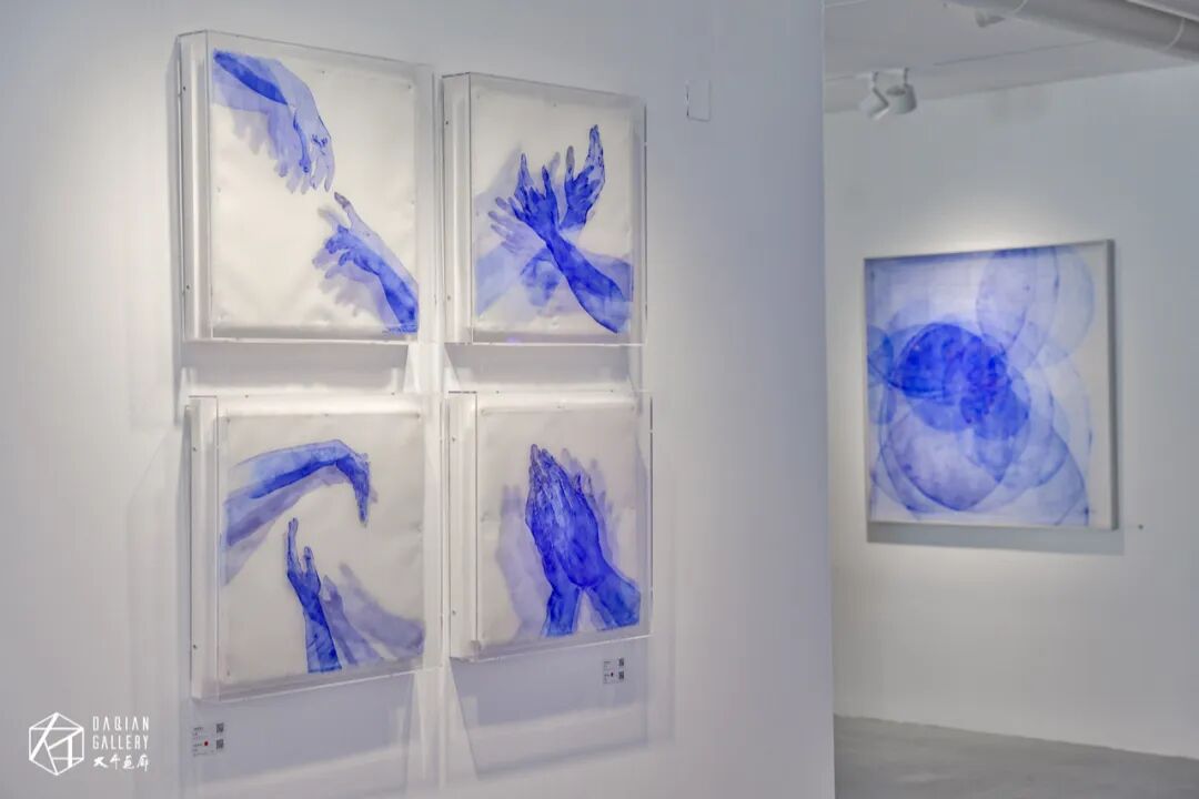 在展览现场我们看到沈采作品,大部分都是以蓝色为主色系,在谈到为何偏爱蓝色时,沈采表示:“我对蓝色还是有一定的偏爱的,也与蓝色的理性特质有关。蓝色呈现出一种神秘而冷静的氛围。符合我所要表达的艺术理念。其实我实验了很多颜料,从水彩到国画颜料,然后再到一些纺织颜料,我发现这种蓝色的通透性更好,更适合表层层叠叠的效果”。