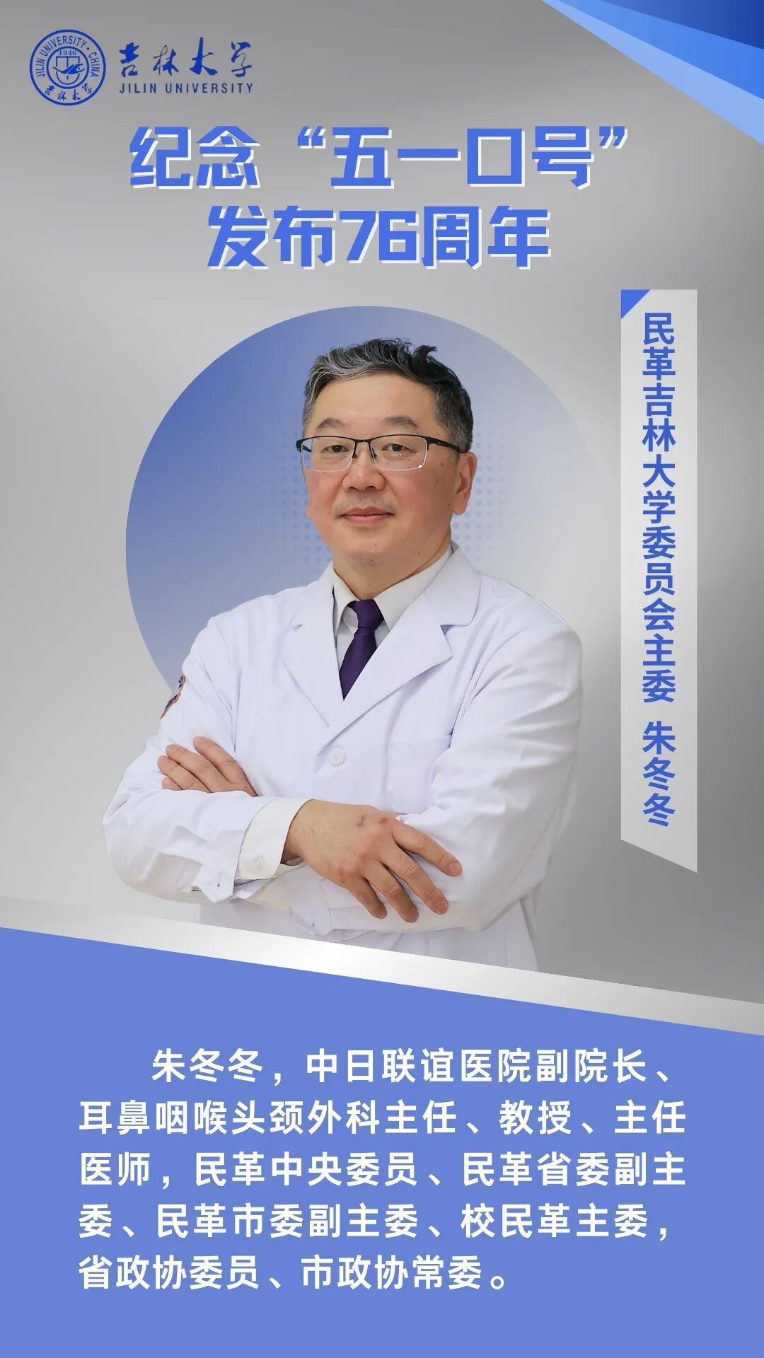 76年前,中国共产党发布的“五一口号”,揭开了中国共产党同各党派、各团体、各族各界人士协商建国的庄严序幕,在我国统一战线史和多党合作发展史上具有重要里程碑意义。在不断追求进步的光辉历程里,农工党吉林大学委员会以团结奋斗的姿态,充分发挥界别优势,在医药卫生领域里坚持“医学为道、健康为本”,立足民意、履责尽心,在践行使命初心的逐梦之路上砥砺前行。农工党吉林大学委员会将继续与党踏实耕耘,不负韶华使命,持续深入学习贯彻习近平新时代中国特色社会主义思想和中共二十大精神,全面加强自身建设,提高中国特色社会主义参政党建设水平,在科学调研、深入基层的基础上建诤言、献良策,为加快推动高质量发展作出更大贡献。
