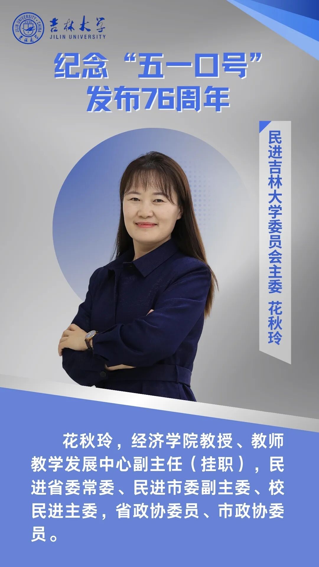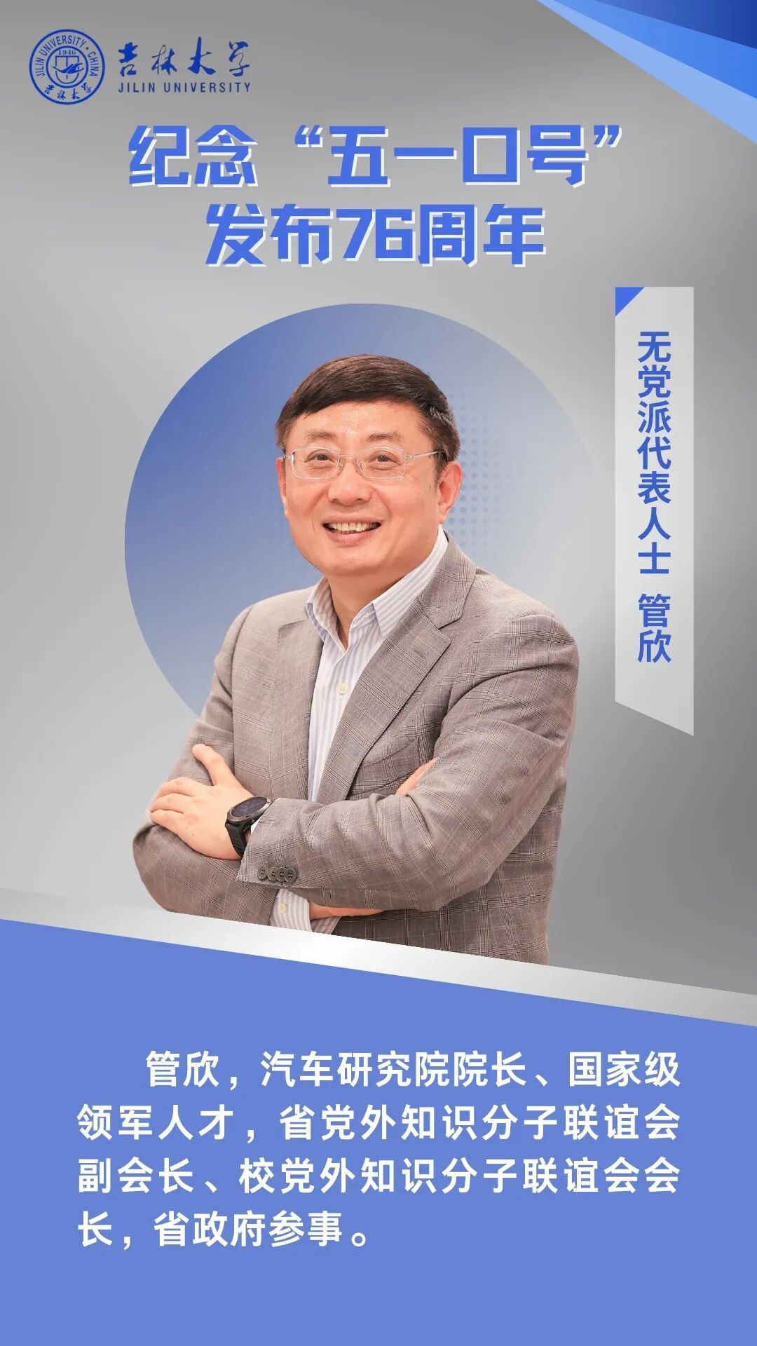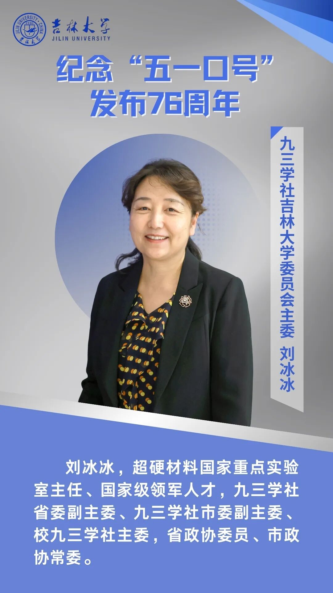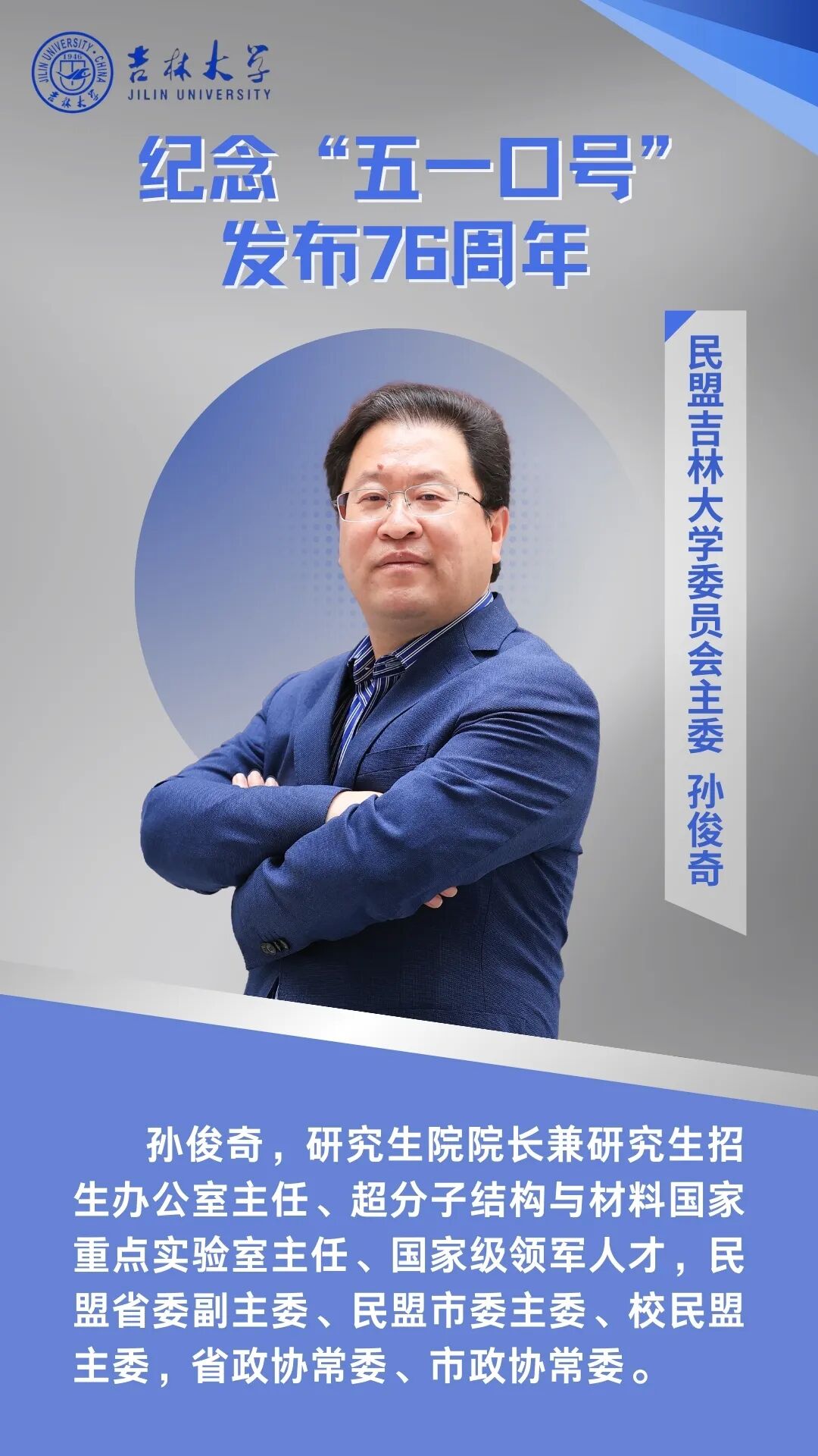 76年前,中共中央发布“五一口号”,这是统一战线和多党合作发展史上具有里程碑意义的重大历史事件。今天,我们要把纪念“五一口号”与发挥参政党的职能作用结合起来,把九三社员立足岗位建功成才和履行参政党职能相结合,知责于心、担责于身、履责于行。九三学社吉林大学委员会将继续坚定不移地坚持中国共产党领导的多党合作和政治协商制度,继承和发扬爱国、民主、科学优良传统,充分发挥党派特色优势,在推动学校、区域经济社会高质量发展的事业中持续贡献力量。