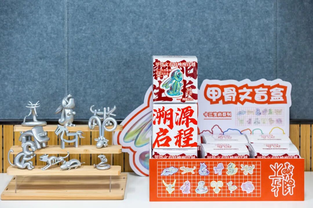 吉林大学艺术学院设计系的几位同学,将甲骨文与现代潮玩相结合,以十二生肖的甲骨文字作为题材进行剖析,将甲骨文字体卡通化设计,并进行立体建模,选取符合年轻潮流的镭射材质3d打印,制作出了精美的盲盒模型、卡通甲骨钥匙扣等潮玩礼品。并且选取寓意吉祥的“朝阳生长”作为活动宣传主题,设计了一系列精美的明信片,挂件,帆布包等文创纪念礼品。同时为本次活动的现场设计游戏环节,并准备海报美陈等大量物料。在这过程中,几位同学学以致用,不断推敲完善,践行吉林大学求实创新精神,为本次活动作出了根本性的贡献。