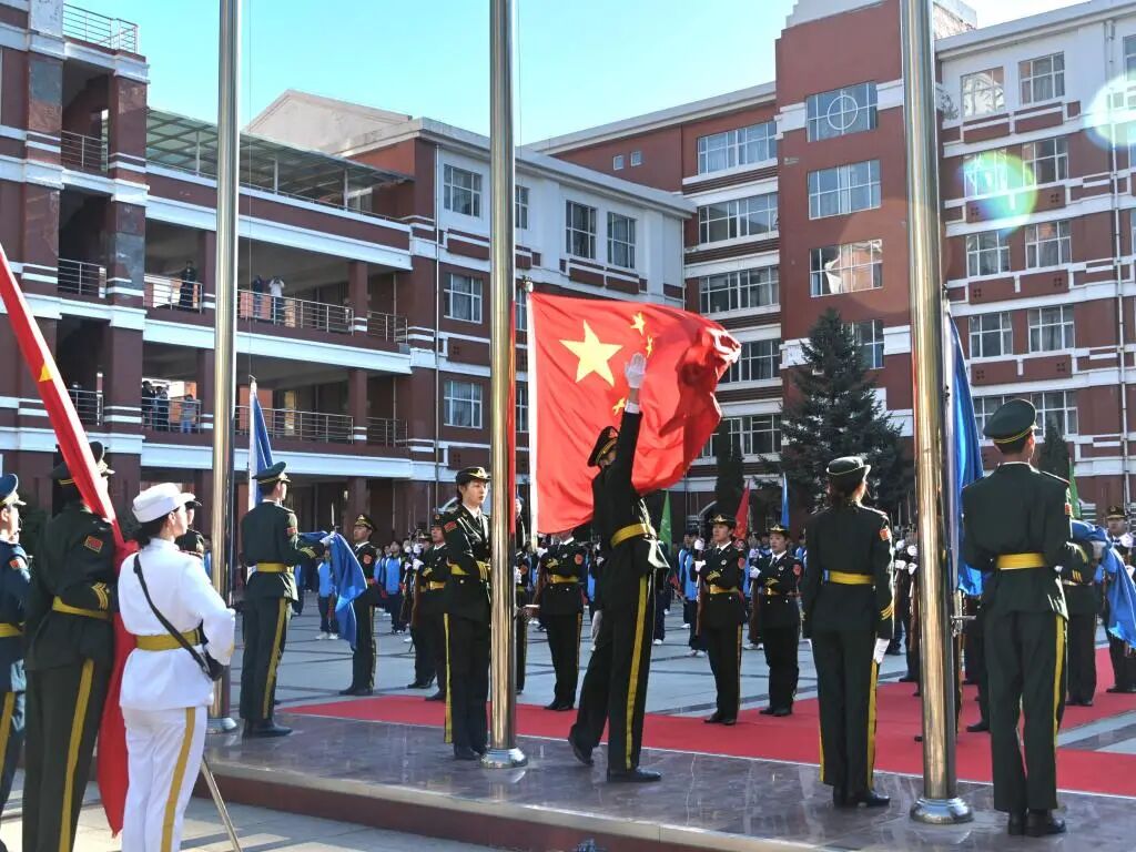 上午7时,升国旗仪式准时开始。在庄严肃穆的国歌声中,五星红旗缓缓升起,全体师生整齐划一,向国旗行注目礼,表达了对伟大祖国的无限敬爱之情。