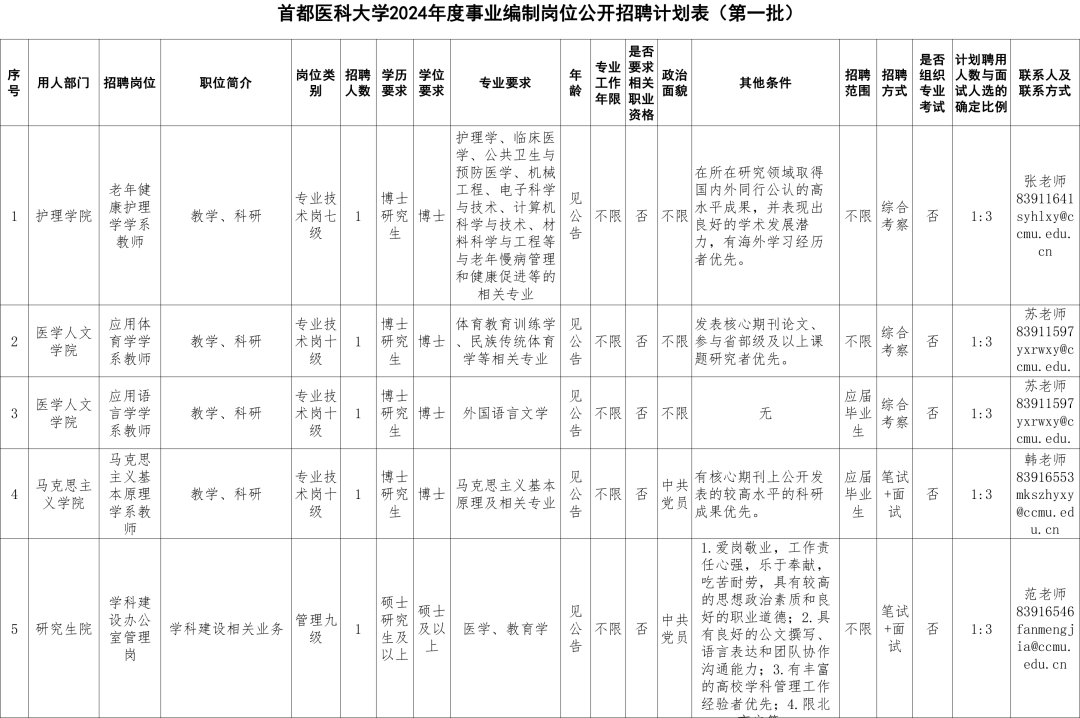 本批次拟招聘教师9名、专业技术人员5名、管理人员4名,具体岗位及要求详见《首都医科大学2024年度事业编制岗位公开招聘计划表(第一批)》。