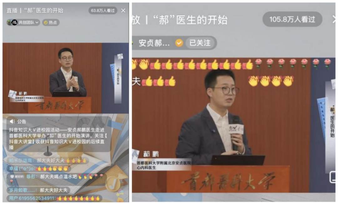 4月23日下午,学校第二教学楼78教室座无虚席,线上抖音大讲堂直播也火热进行中。此次活动是“抖音知识大V进校园”第二季活动之一,也是我校为加强医学生职业生涯规划而精心策划的学生就业“暖春行动”的又一创新举措。抖音知识大V——我校优秀校友、附属北京安贞医院心内科医生郝鹏应邀回到母校,为学弟学妹讲述“郝”医生的成长故事。此次活动线下近200名同学参加,超100万观众线上观看。