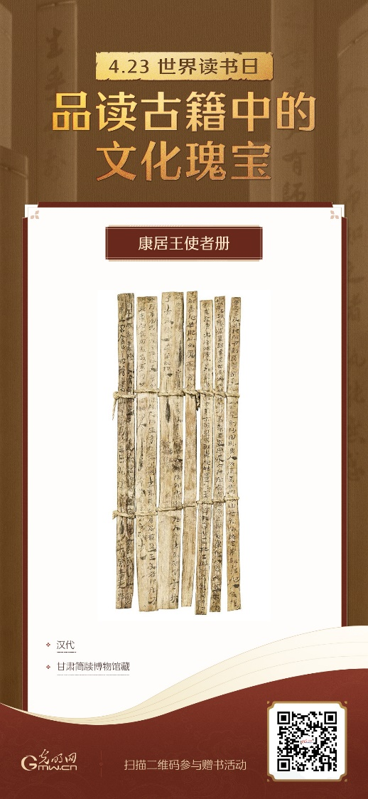 “康居王使者册”由7枚汉简编连成册,简文主要记载了康居王使者五人从敦煌入关后发生的故事。此件文物不仅为研究汉朝与西域康居国友好往来提供了第一手资料,更见证了丝绸之路的繁荣通达。