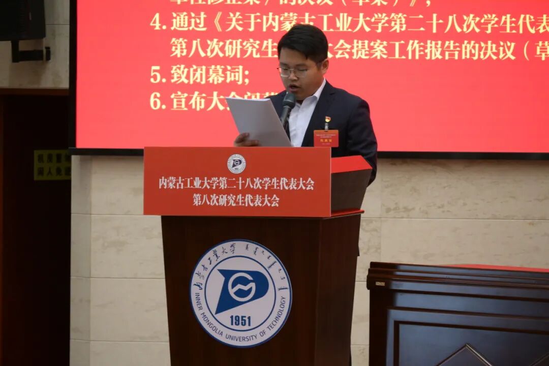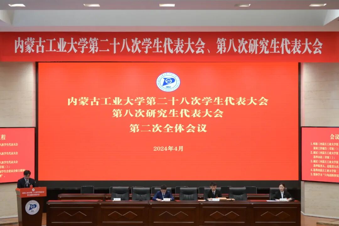 会议审议通过了《内蒙古工业大学第二十七届学生会、第七届研究生会工作报告》《内蒙古工业大学学生会、研究生会章程修正案》《内蒙古工业大学第二十八次学生代表大会、第八次研究生代表大会提案工作报告》,选举产生了内蒙古工业大学第二十八届学生会、第八届研究生会委员会委员、主席团成员。与会代表集体学习了“六句话的事实和道理”。