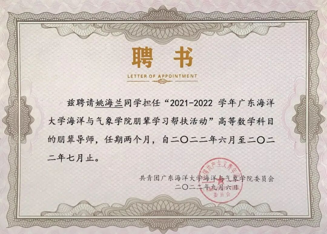 担任“朋辈导师”对于姚海兰来说是一次特殊的体验。她自豪地介绍了海洋与气象学院这个传统,“这是我们学院一个良好的传承,高年级的同学帮助低年级的同学,建立一种互相的关系。”这段经历也让她正式体验了一次为人师的感觉,从准备讲义到课上传授再到课后解答,这都需要她自己去琢磨策划。虽然这是一个很大的挑战,但她也希望自己能够真切地帮助到学弟学妹。“我希望自己的行为能对学弟学妹起到好的引导,希望把自己学到的知识、养成的好习惯,或者是一些学习技巧分享给他们,让他们学习得能够轻松一点。”这是一个让姚海兰与学弟学妹共同成长的经历,榜样的力量让这份传承继续发光发热。