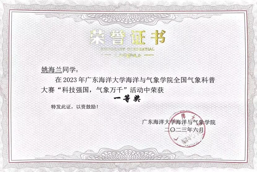 荣获国家奖学金、国家励志奖学金、校优秀学生一等奖学金、“三好学生标兵”“三好学生”等奖项;获得航天宏图教育基金。“i志愿”系统的服务总时长超过300小时,获广东省“二星志愿者”、社区“优秀志愿者”称号;获第十八届全国大学生文学作品大赛二等奖。主持校级大创项目一项;以第一作者发表省级期刊论文一篇;以第三作者发表核心期刊论文一篇。通过四六级等级考试、计算机二级考试;两次担任朋辈导师,在校期间担任海洋与气象学院团委生活心理部部长、生活委员,党务助理等职务。