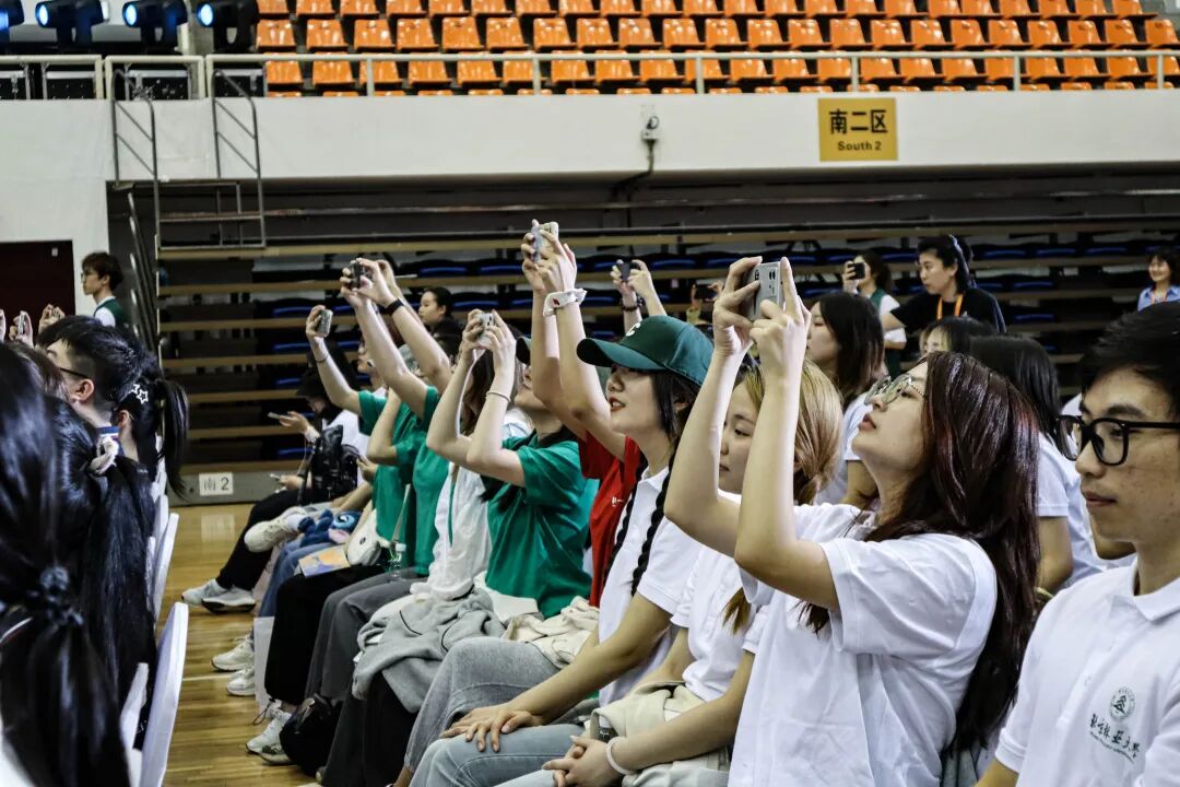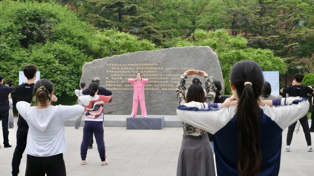 在我校冠军教师、世界武术冠军刘晓蕾的指导下,嘉宾与师生在刻石广场参与了“与冠军一起练习八段锦”的体验活动,共同领略中华传统文化古代导引术的魅力。![]()