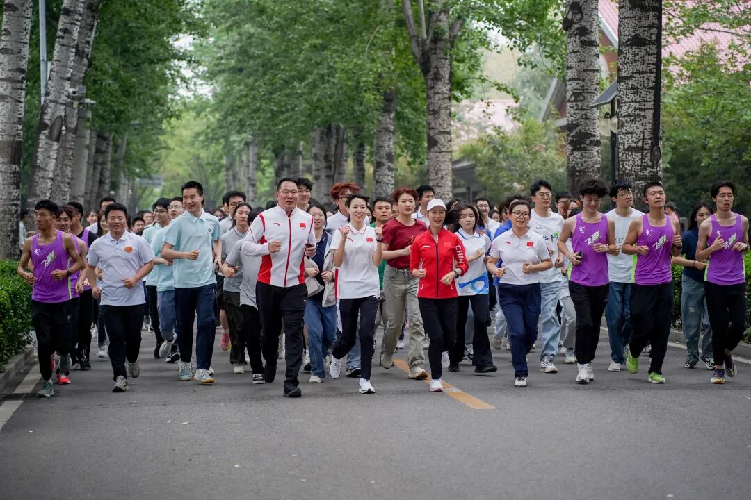 在校园快乐跑环节中,竞走奥运冠军王丽萍、花样滑冰世界冠军张昊、短道速滑世界冠军林孟、冰壶世界冠军王冰玉领跑,来自北京体育大学的配速员带领参与师生在运动出汗中疏解心理压力,提高心理品质。