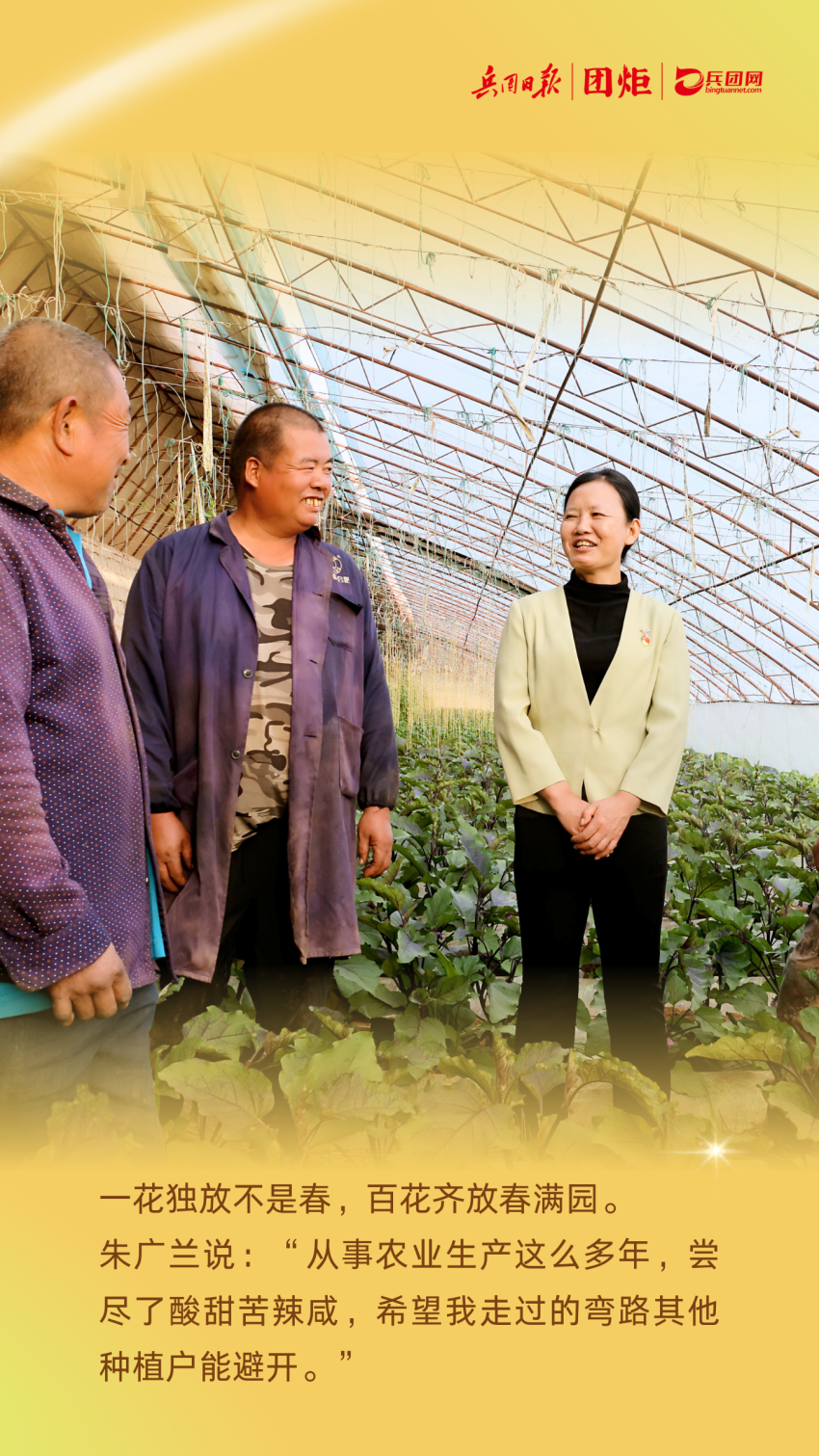 黄田农场六连职工余世美身患小儿麻痹症,一家人生活困难。了解了余世美家的情况后,朱广兰将丝瓜新品种优先给她,并提供种植技术指导,使余世美当年收入9.7万元;五连职工刘文玲种植茄子、黄瓜等作物,收入一直不高。在朱广兰的指导下,刘文玲改种丝瓜,当年收入10多万元……技术上帮助,资金上支持,在朱广兰的带动和帮助下,农场20多户职工发展设施农业走上致富路。