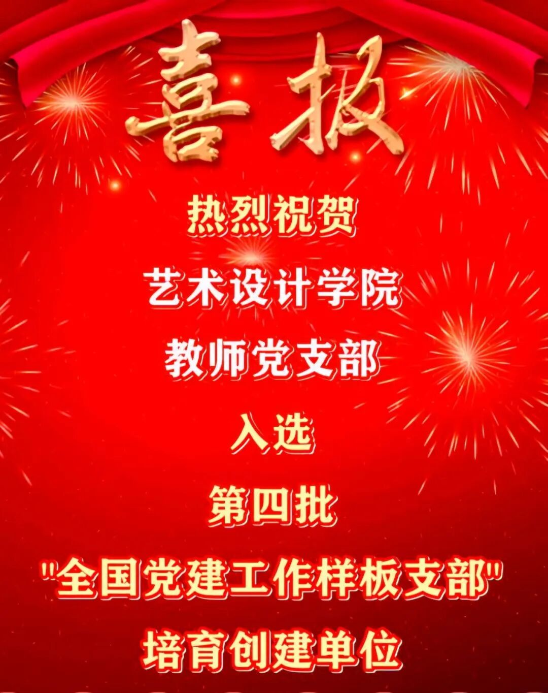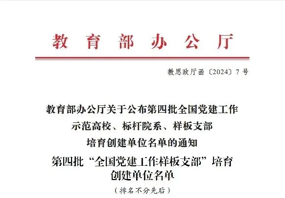 根据《教育部办公厅关于开展第四批新时代高校党建示范创建和质量创优工作的通知》(教思政厅函〔2023〕17号)安排和遴选工作方案,经省级党委教育工作部门推荐、资格审查、专家评审、教育部党的建设和全面从严治党工作领导小组成员单位集中审议、结果公示,我院艺术设计学院教师党支部入选“全国党建工作样板支部”培育创建单位,这是我校首个入选“全国党建工作样板支部”培育创建单位的基层党组织。