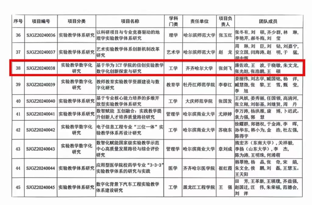 日前,黑龙江省教育厅公布了首批黑龙江省实验教学和教学实验室建设研究项目立项结果,我校申报的项目“基于华为ICT学院的信创实验教学数字化创新探索与研究”获批立项。