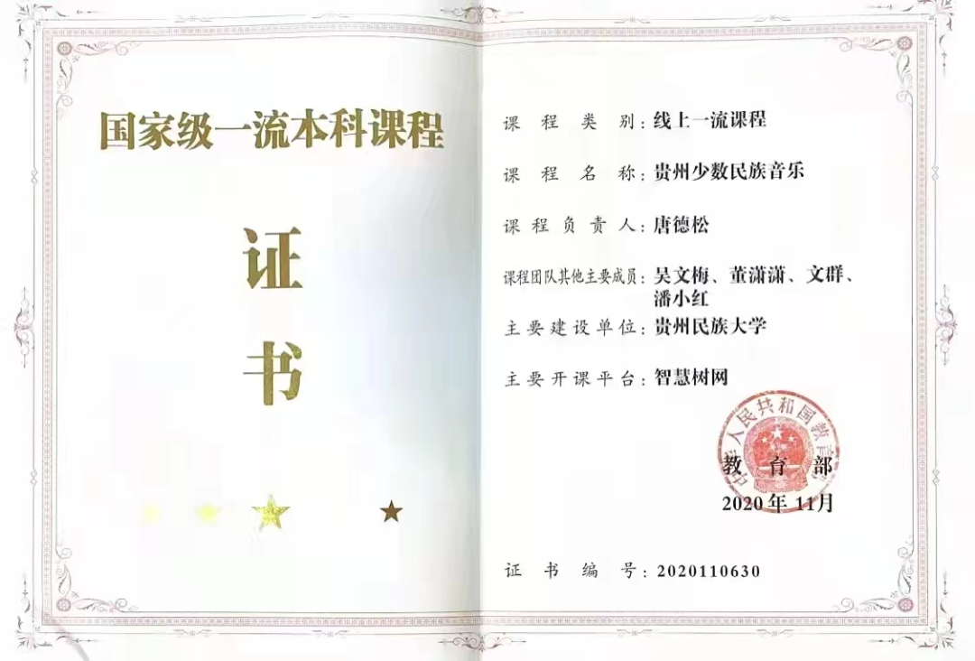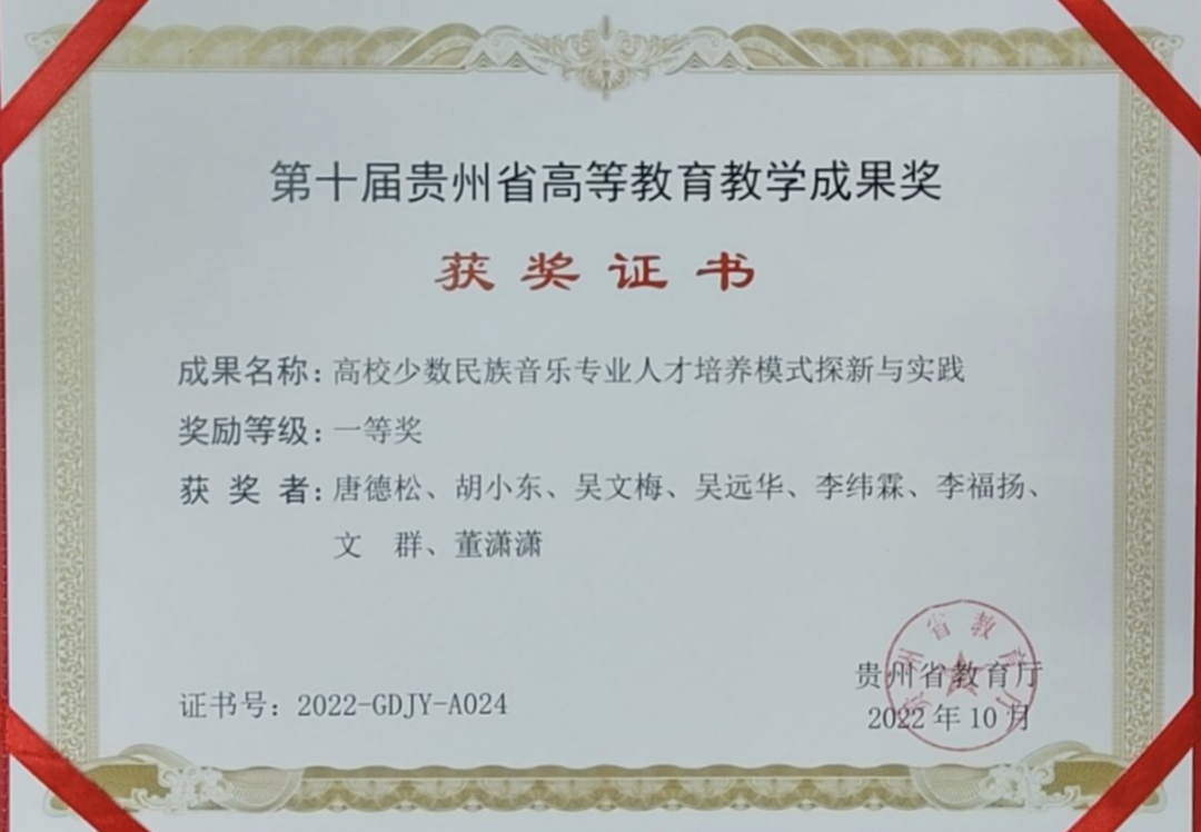 本专业坚持中西结合、民族为根,特色为主,坚持以歌咏志、以乐化人,将民族音乐教育贯穿到基础理论、技能训练和文化修养等各类课程中,逐步构建起贵州民族特色音乐教育体系,着力培养民族地区应用型、复合型、原创型艺术人才。2019年获批教育部中华优秀传统文化侗族大歌传承基地;2020年,专业课程《贵州少数民族音乐》获批国家级一流本科课程;2023年,专业课程《舞台艺术实践》获批国家级一流本科课程。