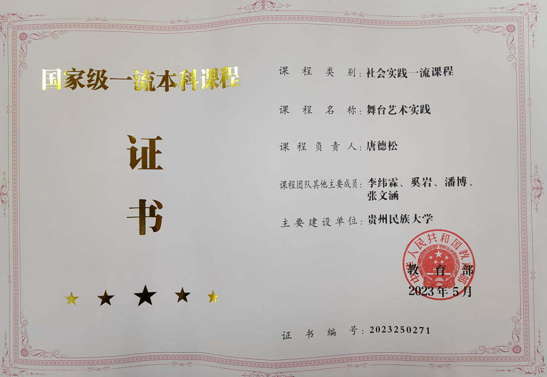 贵州民族大学舞蹈表演专业于2013年开始本科生培养,2021年获批国家级一流本科专业建设点,同时也是贵州省同专业中最早获批的建设点。特色实践课程《舞台艺术实践》于2023年获批国家级一流本科课程,核心课程《贵州少数民族舞蹈》于2022年获批省级金课,现建有省级金课3门。