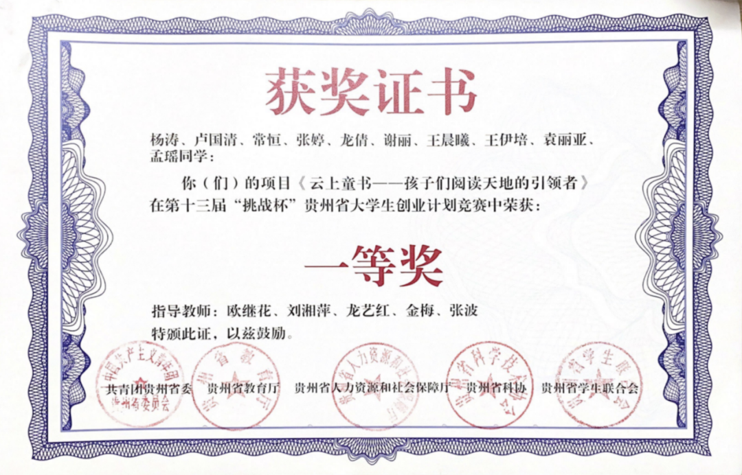 获得“挑战杯”贵州省大学生创业计划竞赛一等奖