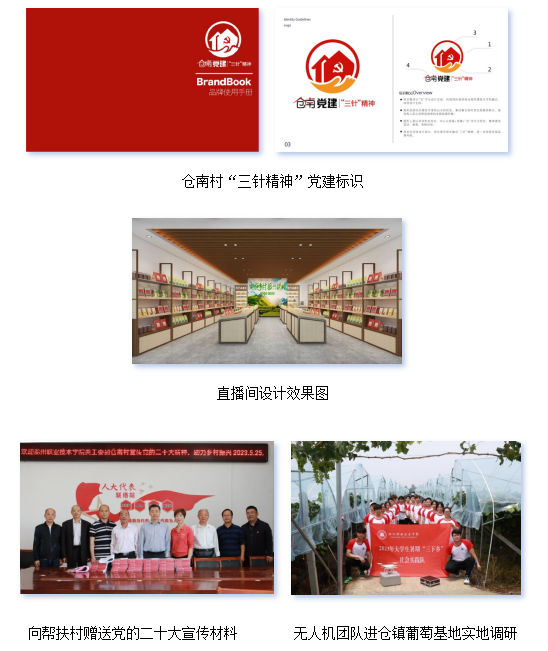 为推进高质量党建引领高质量乡村振兴,学校主要领导多次带队赴帮扶村调研指导,邀请定远县仓镇主要负责同志来校交流,乡村振兴工作取得明显成效。通过推动双方基层党支部开展共建结对,为仓南村党支部量身定制具有高辨识度的“三针精神”党建标识方案,深入挖掘地域特色与文化创意元素,设计特色文创产品、IP形象设计等。多措并举解决农产品销售“难问题”,在技术支持方面,数字媒体系党支部为仓镇设计了直播间效果图。在物资采购方面,广大教师积极订购农副产品,采购仓南村农产品共20万元。在建设资金支持方面,学校拨款40万元用于帮扶村村民组人居环境整治和直播间等相关项目的建设工作。在拓宽销售渠道方面,校园超市、教学楼、宿舍等地设置扶贫专柜销售优质扶贫产品。推进党建业务深度融合,一名专家教授为仓南村党员干部宣讲党的二十大精神。校级“三下乡”重点团队和青马班部分学员,赴仓南村进行无人机知识科普等实地调研等活动。项目产出的“基于仓镇乡村‘1312’品牌推广策略调研报告”在第十届“挑战杯·华安证券”安徽省课外学术科技作品竞赛中获得二等奖。
