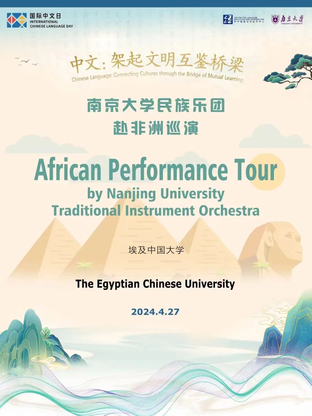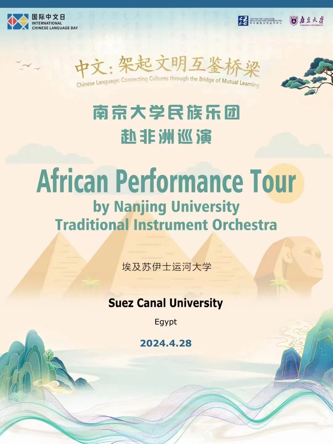 据悉,4月27日、28日,南大民乐团还将赴埃及中国大学及埃及苏伊士运河大学进行巡演。期待南大民族乐团继续在非洲大陆奏响南大之音,奏响青年之音,奏响中华之音!