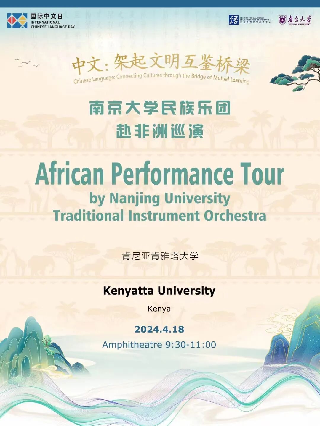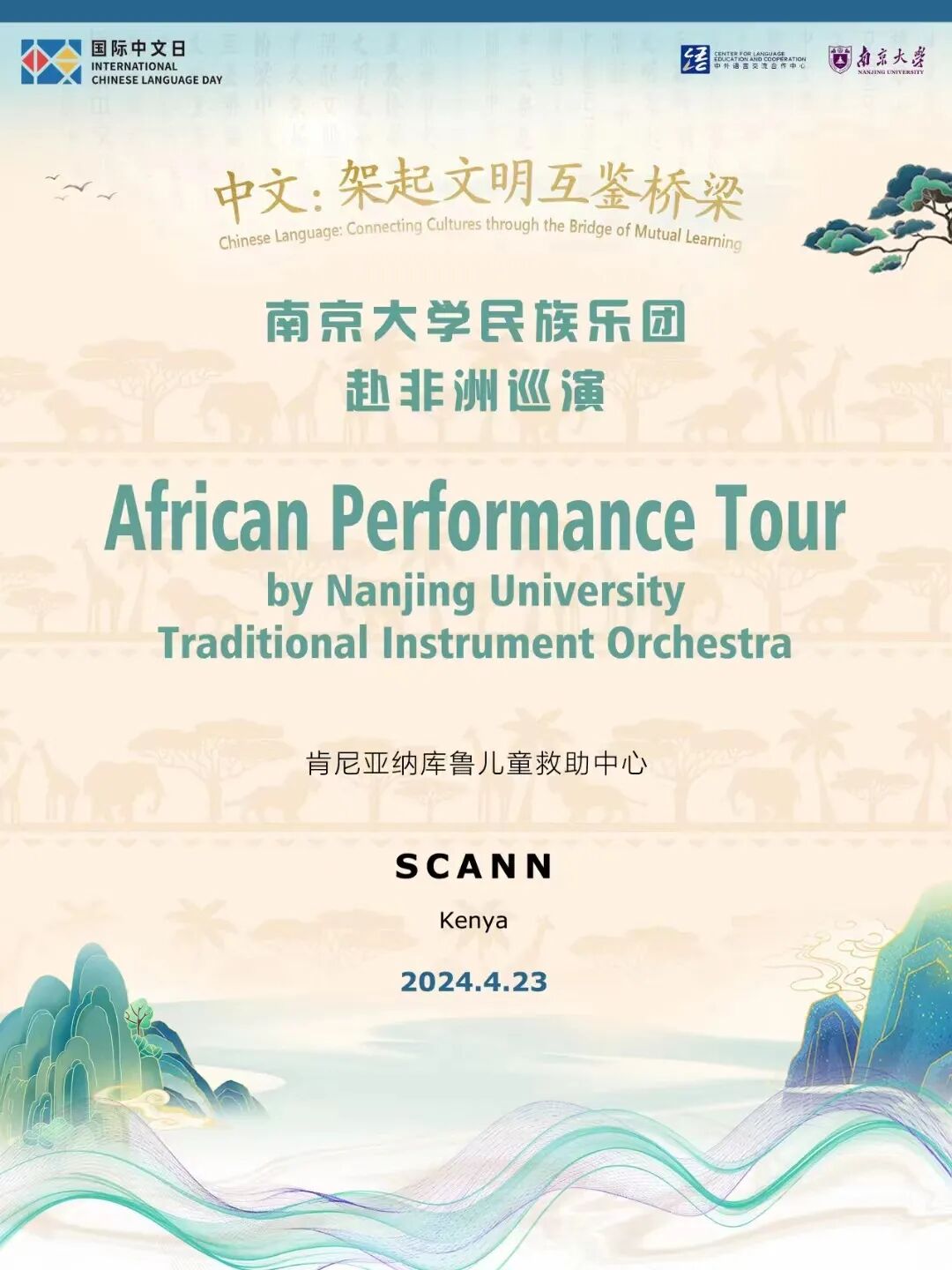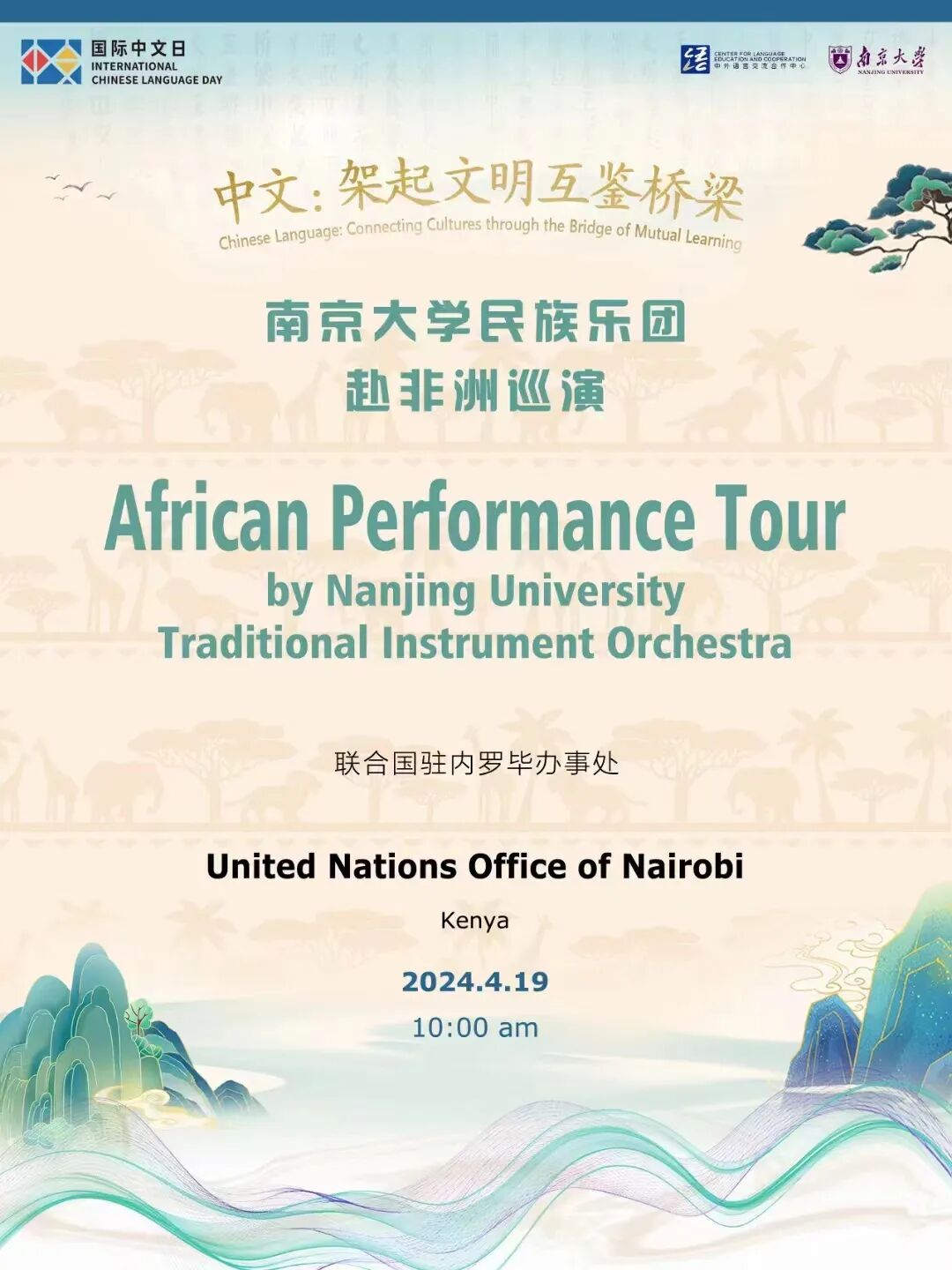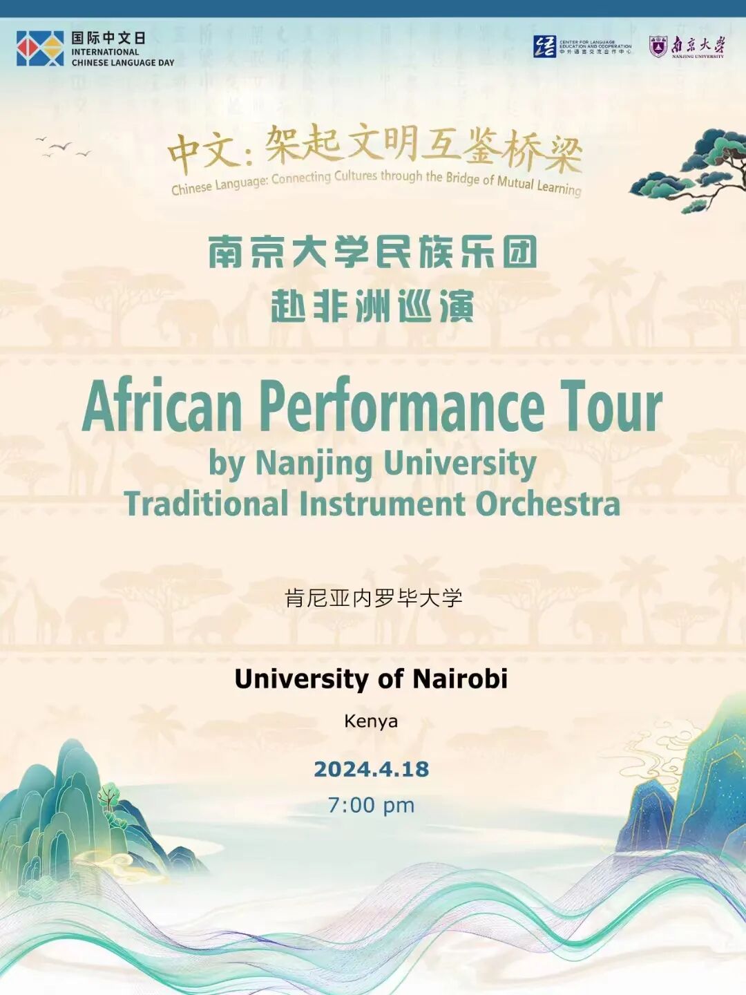4月18至19日,南京大学民族乐团赴内罗毕大学和联合国内罗毕办事处演出,内罗毕大学孔子学院搭设文化展台,让来宾体验到了丰富多彩的中国文化,本次活动被人民网、新华网等多家媒体广泛宣传报道。