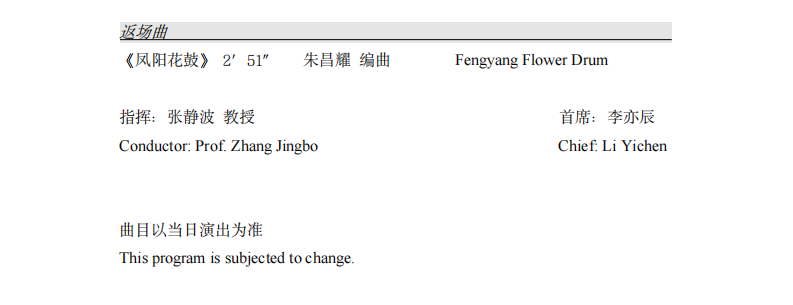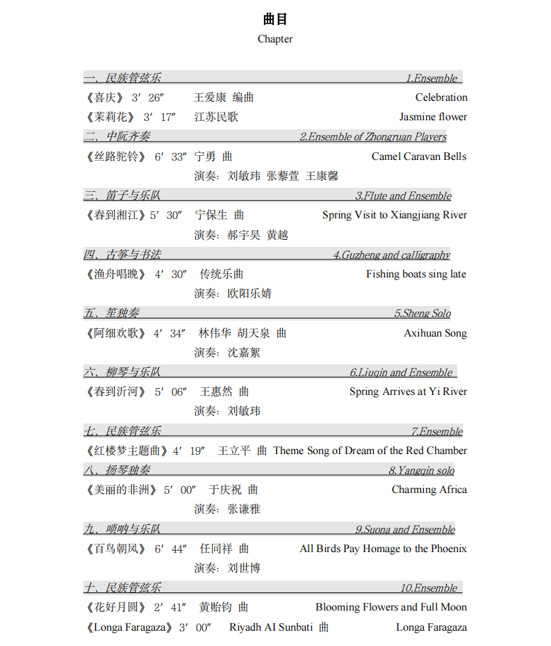 所选曲目涉及中国各地风格和不同文化内涵,兼具传统曲目和现当代作品。乐曲《喜庆》根据江南民间音乐改编,充分展示了江南人民节日喜庆的热烈场面,具有浓郁的江南风格和时代特点;《茉莉花》描绘了江苏地区清新美丽的自然风光和独特的文化氛围,它是中国民间文化的重要组成部分,也是中国传统音乐的代表作之一;《丝路驼铃》具有浓郁的西域风情,以清新别致的旋律、热情奔放的节奏,描绘了古丝绸之路上骆驼商队行进和休憩的情形,表达“一带一路”倡议的文明互通互鉴的精神;《春到湘江》具有鲜明的中国花鼓音乐特色,时而跌宕激情,时而流畅如歌,清新美妙的旋律,表现了湘江两岸生机勃发的自然风光和人民对家乡未来的美好憧憬;《阿细欢歌》展现了彝族人民满怀信心与豪情,打赢脱贫攻坚战,阔步迈向民族团结、乡村振兴新征程的新愿景;《春到沂河》具有山东特色,通过柳琴这一弹拨类高音乐器,描绘了沂河两岸的美丽风光,表达了人们对美好生活的赞美之情;《凤阳花鼓》根据安徽民歌改编而成,旋律欢快热烈,风趣幽默,具有独特的乡土气息;《百鸟朝凤》百鸟和鸣,凤凰翱翔。唢呐一声响,天下音绕梁。唢呐名曲《百鸟朝凤》以热情欢快的旋律唤起人们对大自然的热爱,寓意着幸福生活的美好意境;《花好月圆》极富北方韵味,表现了人们在花丛月下轻歌曼舞、尽情欢乐的场面。
