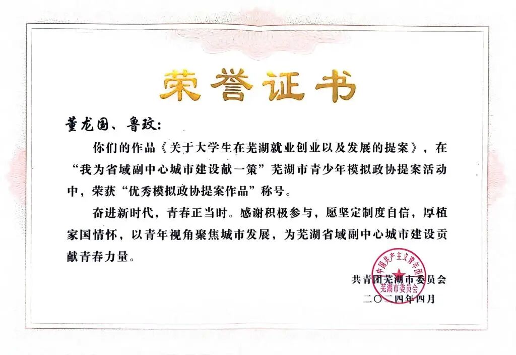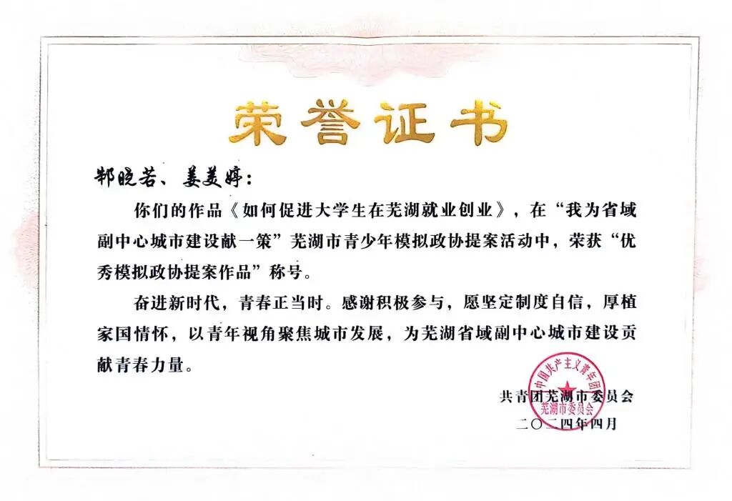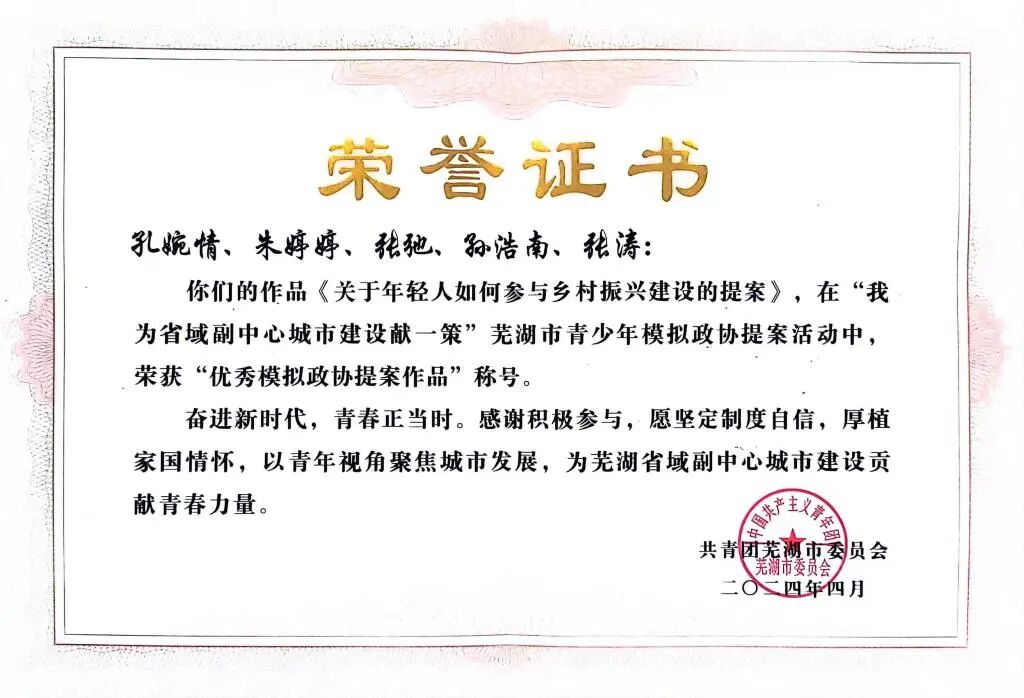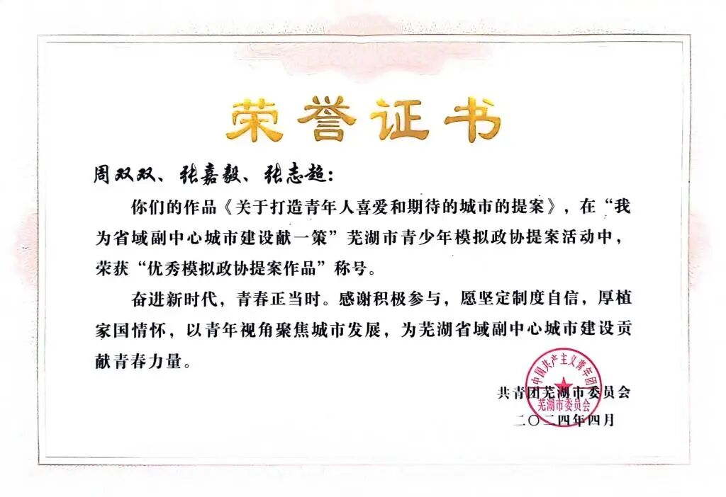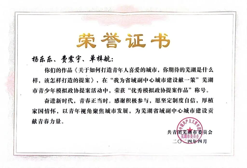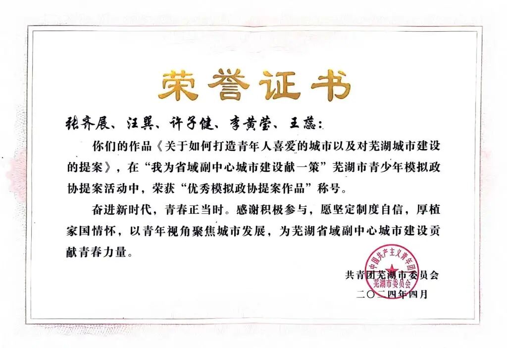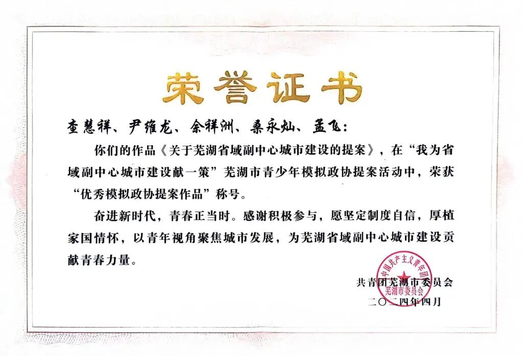 近日,由共青团芜湖市委员会举办的“我为省域副中心城市建设献一策”芜湖市青少年模拟政协提案活动结果公布,学校7个学生团队荣获“优秀模拟政协提案作品”称号。
