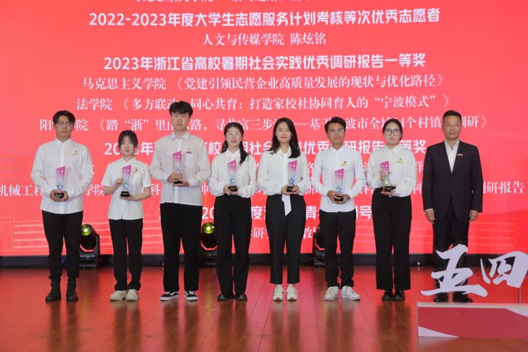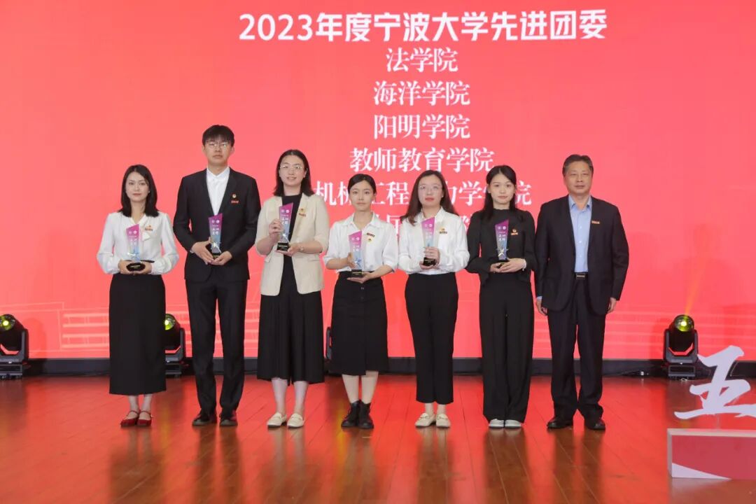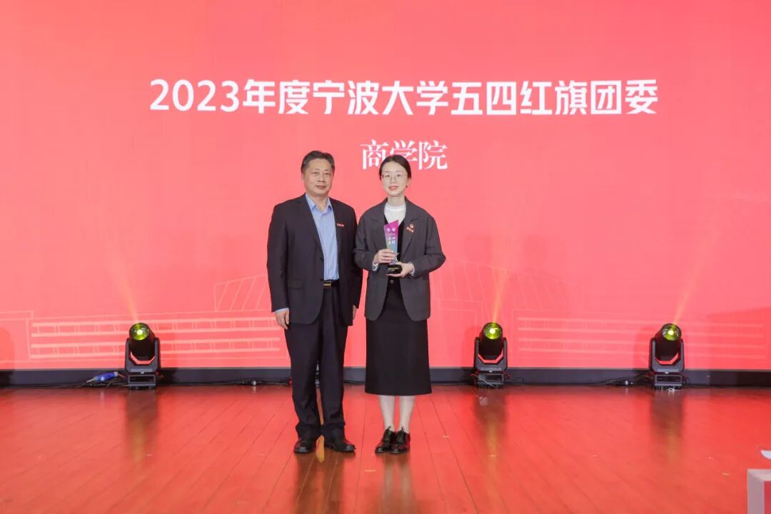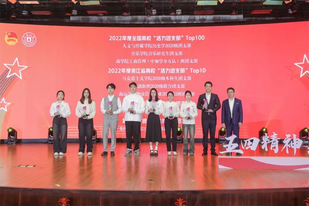 党(校)办负责人为全国高校“活力团支部”Top100、浙江省高校“活力团支部”Top10、浙江省成绩突出团支部第四届宁波大学金牌风采团支部颁发奖杯