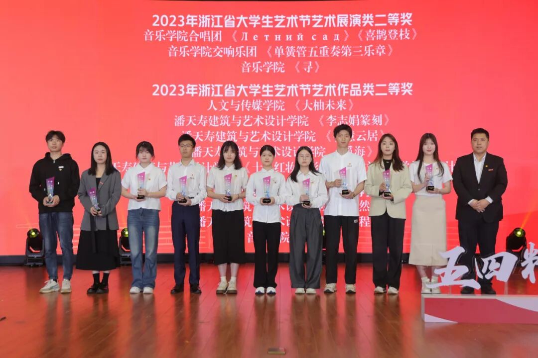 校团委负责人为浙江省大学生艺术节艺术展演类二等奖、艺术作品类二等奖和高校美育改革创新优秀案例二等奖颁发奖杯