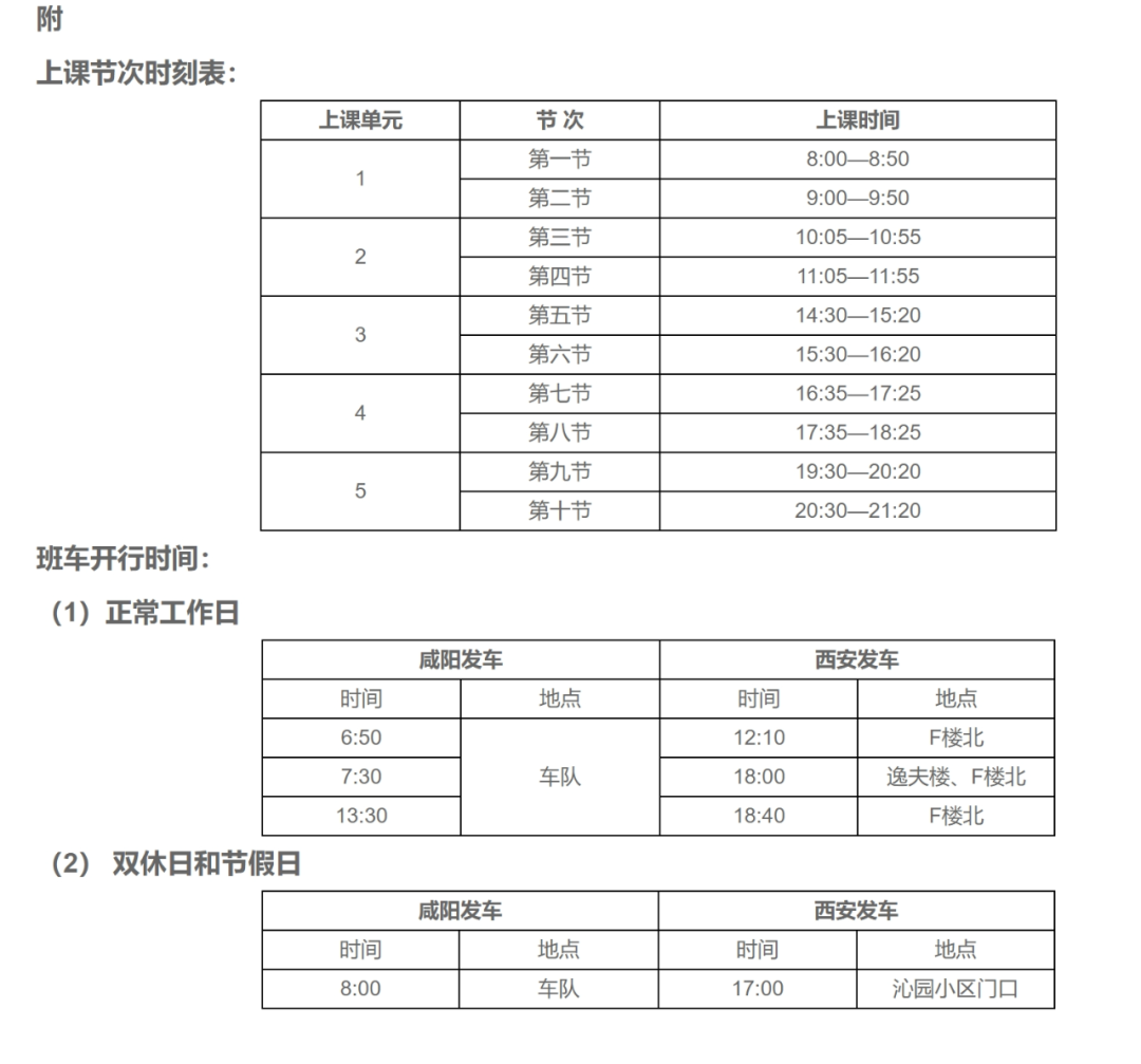 2.上课节次时刻表和班车开行时间附后。