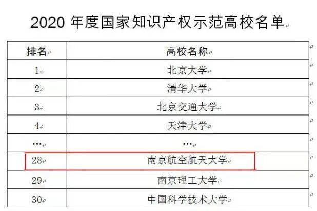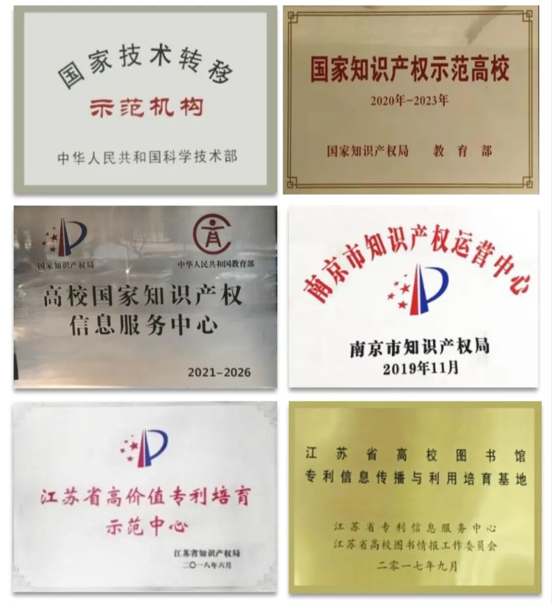 2019年学校获批“南京市航空航天产业知识产权运营中心”,2020年学校获批国家知识产权示范高校(全国仅30所高校)、高等学校科技成果转化和技术转移基地、中国产学研合作促进奖,2021年获批高校国家知识产权信息服务中心、工信部产业技术基础公共服务平台、江苏省知识产权运营能力提升计划项目。