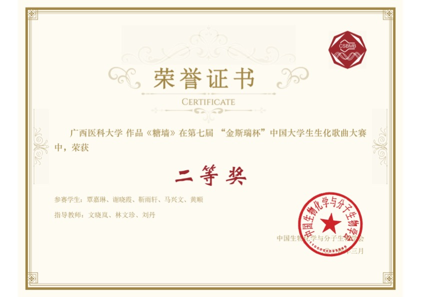 生物化学是生命科学领域最重要的基础学科之一,为激发学生们的学习兴趣,促进学生们对于知识的思考,寓教于乐、寓教于美,将美育和生化特色育人相结合,中国生物化学与分子生物学会主办了七届将本科教学与艺术修养无缝对接的中国大学生生化歌曲大赛。自2021年起,我校基础医学院生物化学与分子生物学教研室在全校范围内举办广西医科大学基础医学院生化歌曲比赛,在学生中广受好评。