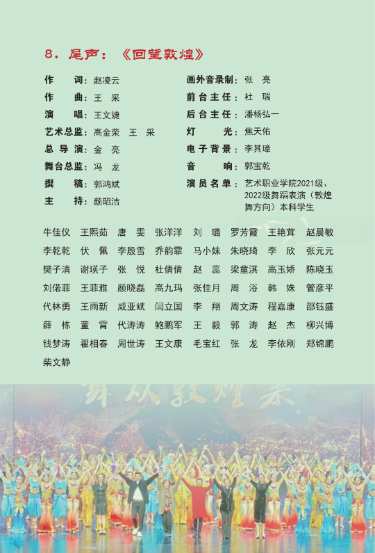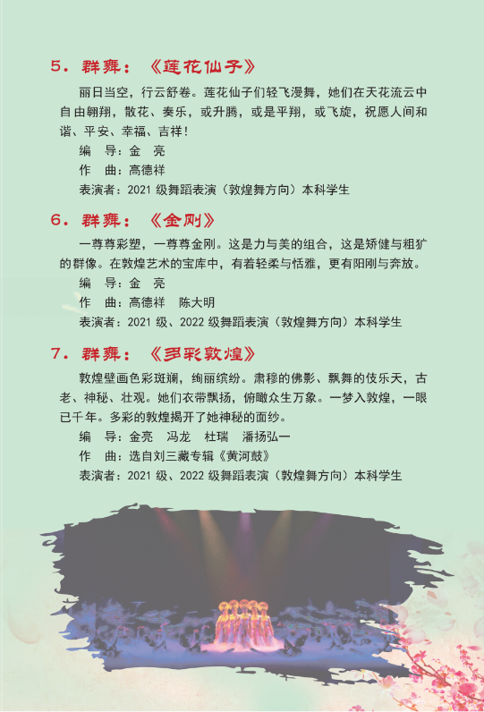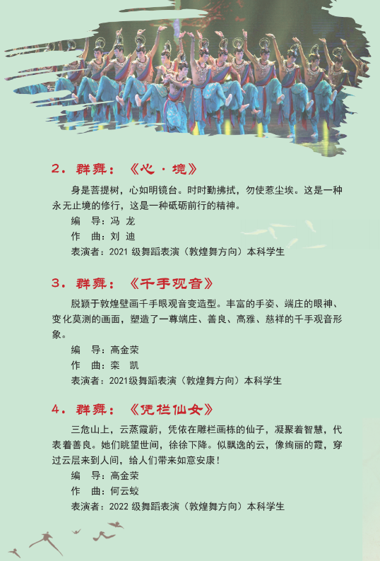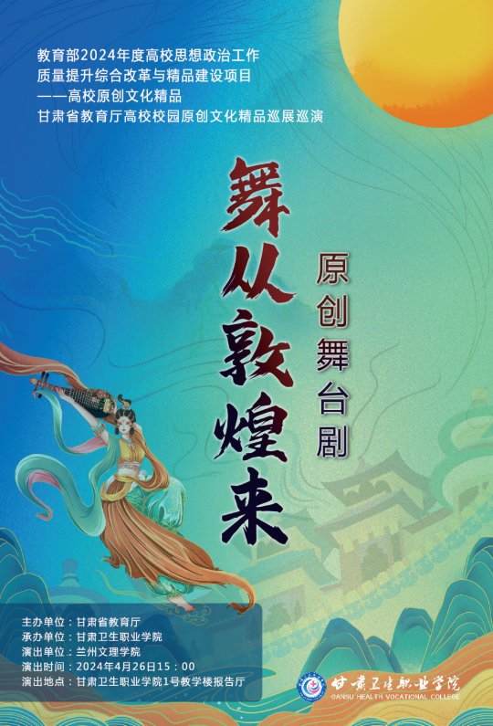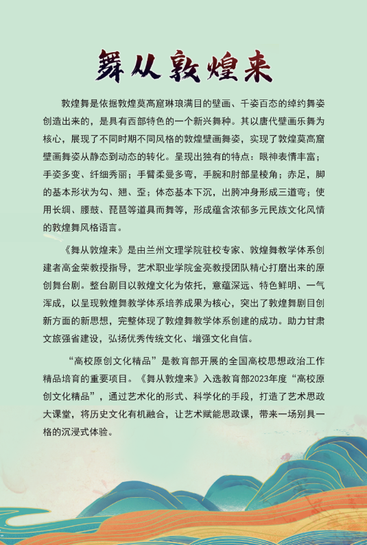 教育部2023年度高校思想政治工作质量提升综合改革与精品建设项目一一高校原创文化精品《舞从敦煌来》将于26日(本周五)下午3点在我校1号教学楼报告厅进行巡演。该剧作为我省唯一入选高校原创文化精品的项目,是兰州文理学院着力打造敦煌舞品牌的又一个重要艺术成果,整台剧目以敦煌文化为依托,意蕴深远、特色鲜明、一气浑成,形成蕴含浓郁多元民族文化风情的敦煌舞风格语言。