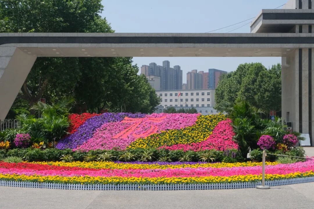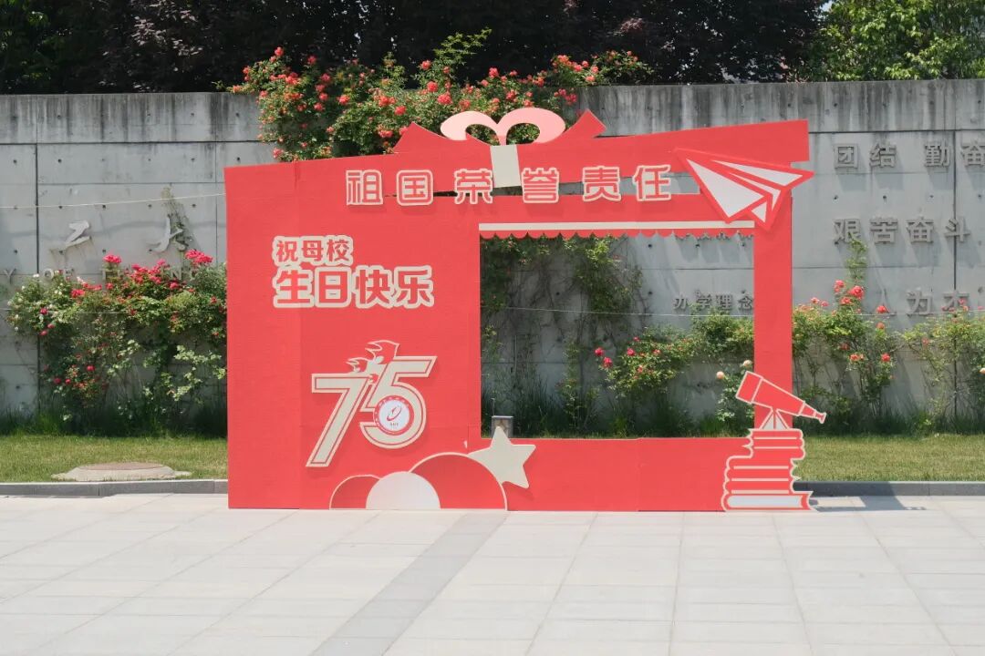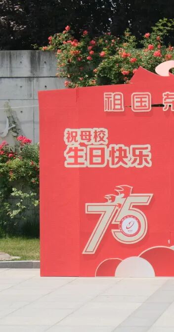 绚烂的花簇拥着建校75周年活动标识