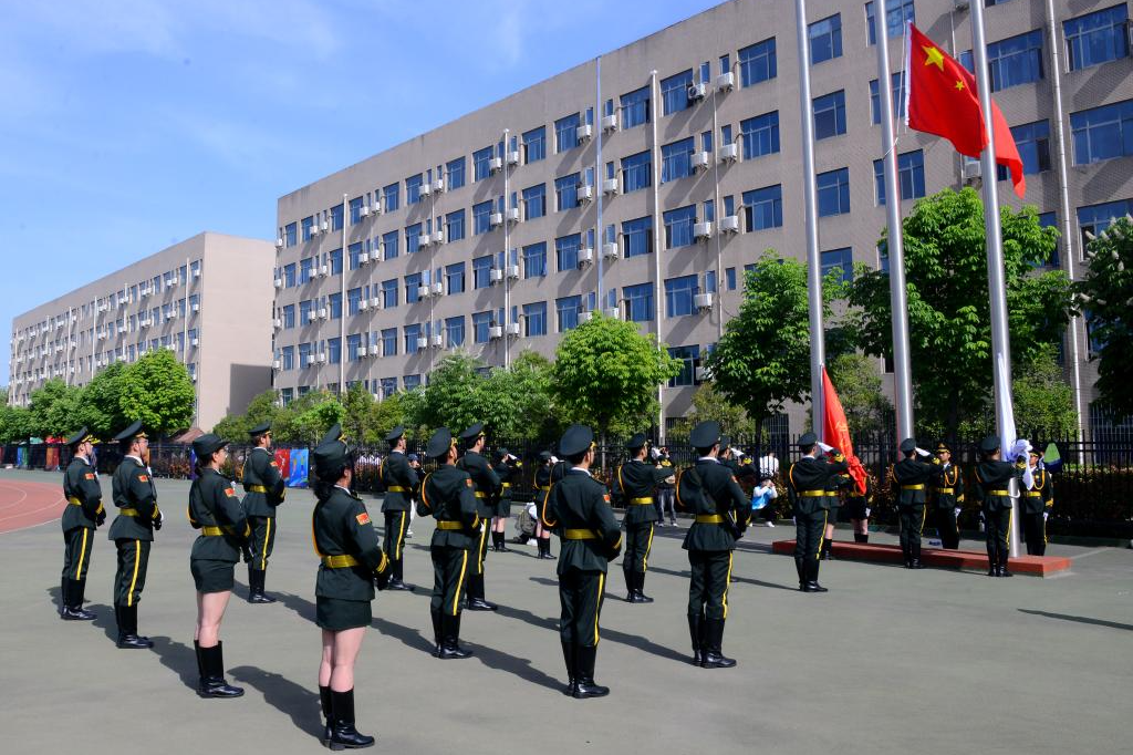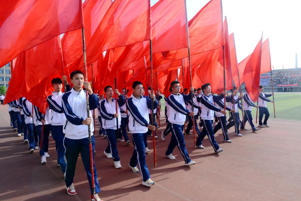 入场仪式完毕,全场起立。在雄壮的国歌声中,大会举行了庄严的升旗仪式,随着五星红旗冉冉升起,全场师生齐唱国歌。