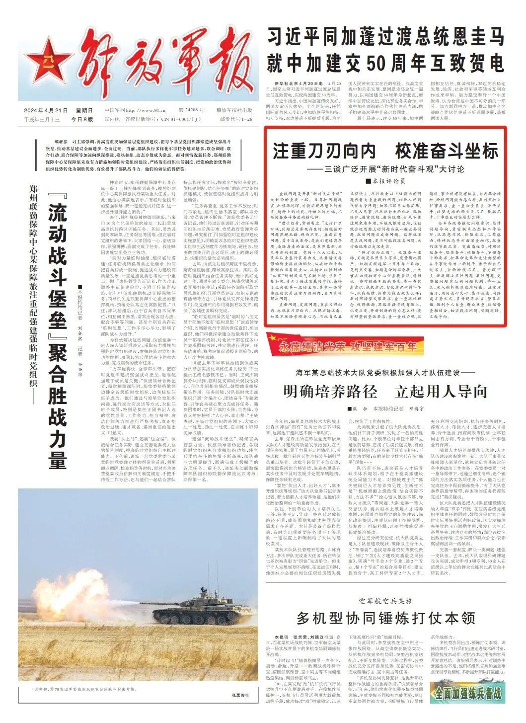 “君子检身,常若有过。”无论什么时候,问题总是客观存在的,怕就怕对问题熟视无睹、视而不见。直面自身问题、勇于自我革命,是我们党过滤杂质、清除毒素的法宝,是革弊鼎新、固本开新的利器。党的十八大以来,人民军队重整行装再出发,从肃清流毒影响到重振政治纲纪、从破除和平积弊到归正备战重心、从持之以恒纠治“四风”到新风正气不断上扬,守住了根和魂,走开了快速发展的步伐,赢得了迈向世界一流的主动,其中一条重要经验就是注重刀刃向内,真刀真枪解决问题。
