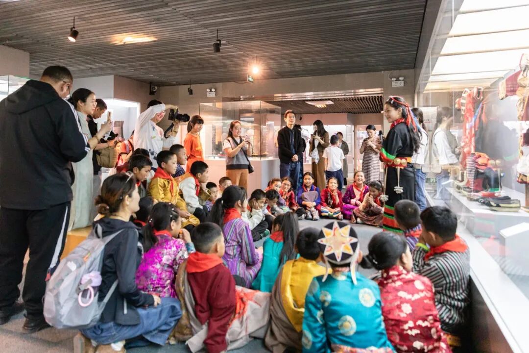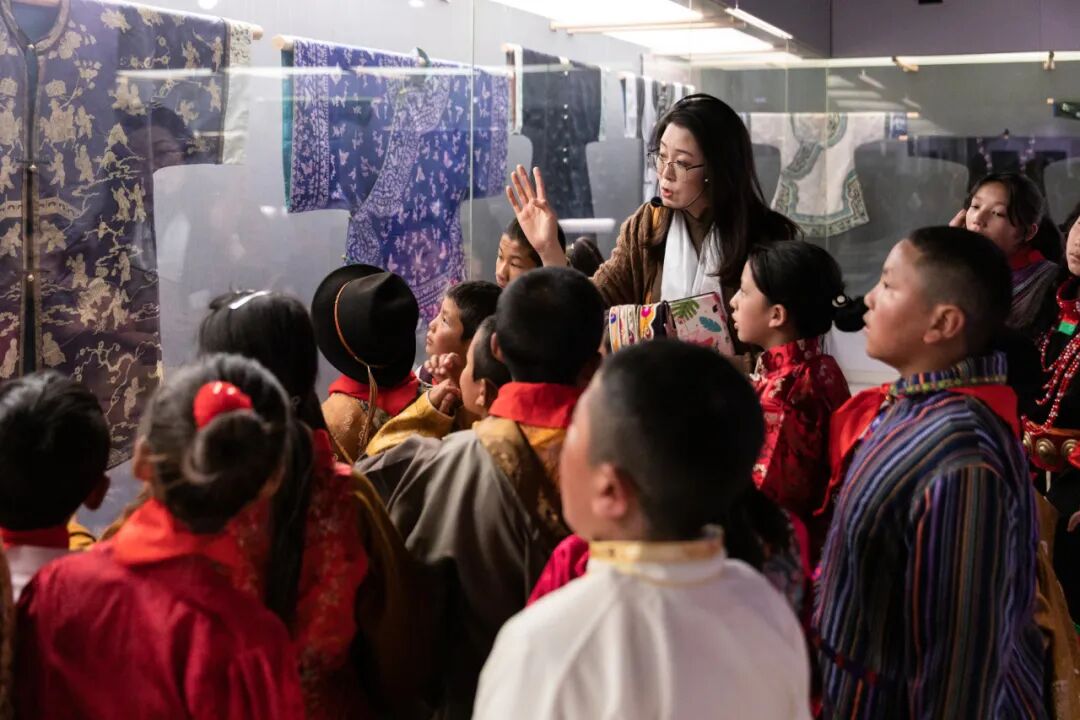 展厅观摩环节,由高丹丹老师带领,从藏区同学们熟悉的藏袍、藏八宝等藏品引入,用互动式讲解方式,从民族发展与交流融合、民族服饰穿用场合、制作过程及搭配方式等方面展开,以点带面、由浅入深地向同学们介绍馆藏中国各民族传统服饰和民族工艺。通过感悟民族服饰之美,把民族团结和爱党爱国的种子以润物无声的方式播撒在青少年心中。