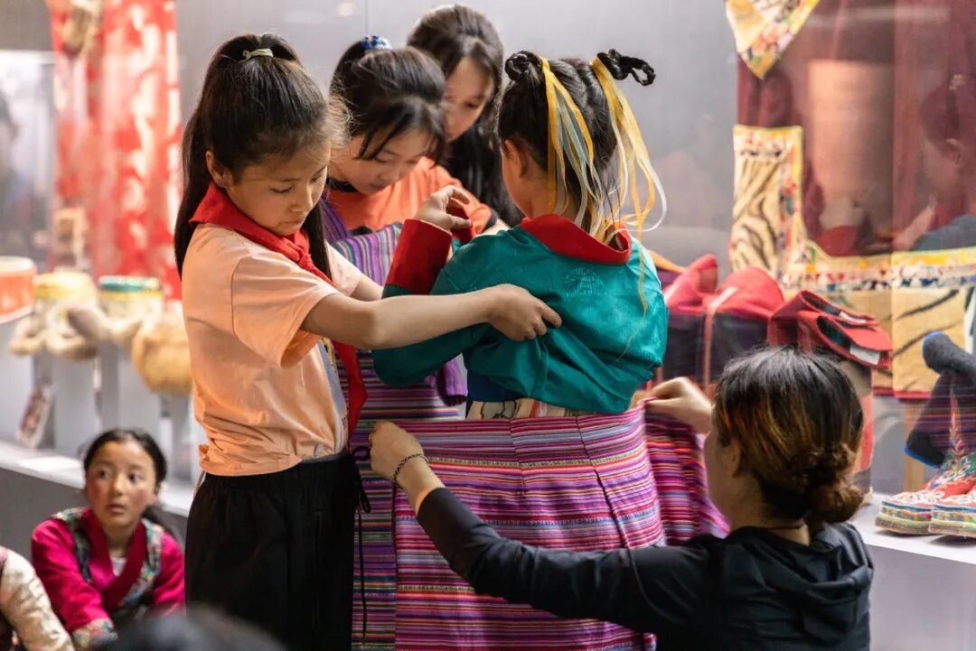 展览观摩结束后,来自藏族、珞巴族、门巴族的学生代表还为大家展示了本民族服装、配饰及其具体穿戴方式,并邀请北京小志愿者们亲身体验藏区服饰的穿戴。这种沉浸式的交流方式,是民族团结交流、民族文化交融的一次生动体验与实践。