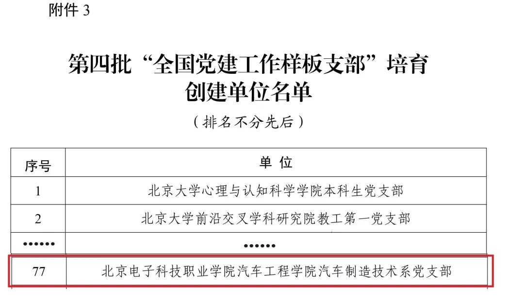 近日,教育部公布了第四批新时代高校党建示范创建和质量创优工作遴选结果。我校汽车工程学院汽车制造技术系党支部入选“全国党建工作样板支部”。至此,学校已建设有1个全国党建工作标杆院系、3个全国党建工作样板支部,获批数量在市属高职院校中名列前茅。