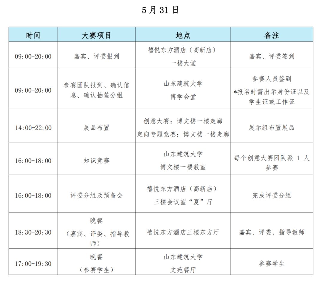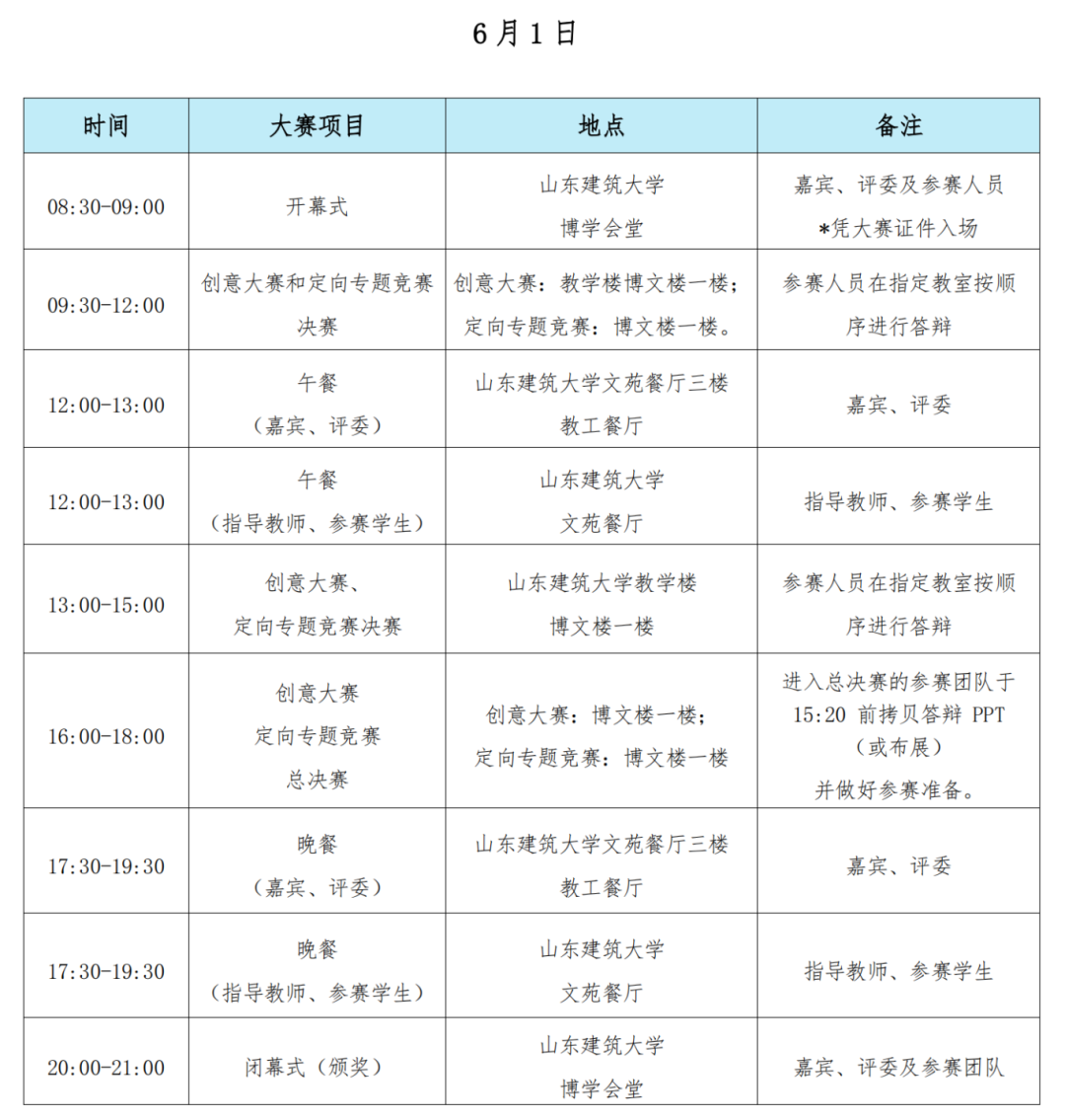 1、参赛团队报到及参赛地点均在山东建筑大学,大赛报到地点、开/闭幕式在山东建筑大学博学会堂举行,创意大赛和定向专题竞赛场地在博文楼一层教室。请各参赛团队提前熟悉路线自行前往报到和参赛。