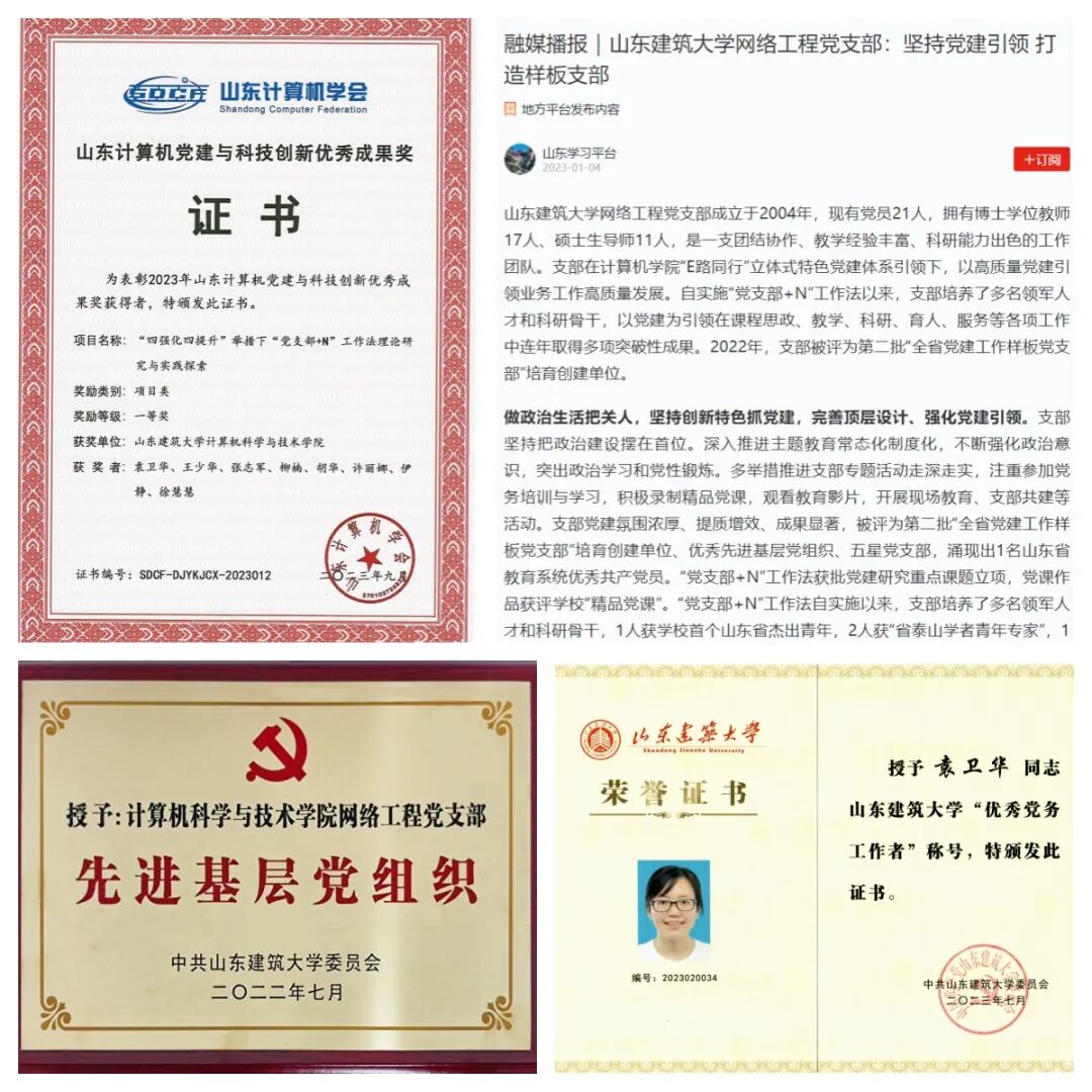 计算机科学与技术学院网络工程党支部以习近平新时代中国特色社会主义思想为指导,传承并创新学院“E路同行”立体式特色党建体系,在党建理论研究方面,坚持把政治建设摆在首位,围绕“七个有力”,设计并实施创新特色、立足发展的党建工作品牌“党支部+N”工作法,研究党建引领下支部在思政、教学、科研、育人和服务等各项工作的高效开展与效果提升;在党建实践研究方面,实施“四强化四提升”举措,充分发挥支部政治引领力,助推党建与业务双融合双促进,创新样板党支部活动新模式,为学校、学院各项事业高质量发展贡献力量。获批全国、山东省党建工作样板支部培育创建单位、山东省高校“双带头人”教师党支部书记工作室培育创建单位。