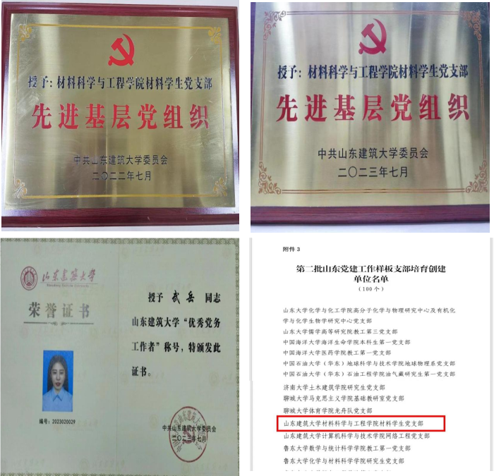 材料科学与工程学院材料学生党支部坚持以习近平新时代中国特色社会主义思想为指导,落实新时代党的组织路线。在主题教育中,党支部注重在专业实践中探索党建特色,如百名师生党员巧用焊接技术同心共筑党徽; 在基础建设工作中,支部创新制定《材料学院党员素质评价手册》《材料学院学生党建工作手册》等多项制度,推动支部建设规范化;同时积极探索“四微一体”发展模式,打造“望道”党建育人品牌,赋能党建发展。近3年来,支部学生党员参加各类大学生竞赛国家级获奖22项,省级获奖40余项,支部连续4年获评山东建筑大学先进基层党组织,获批全国、山东省党建工作样板支部培育创建单位。