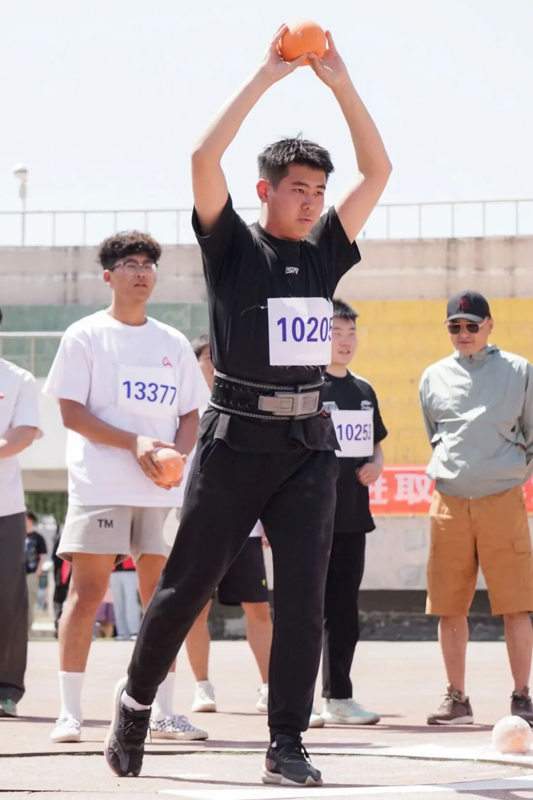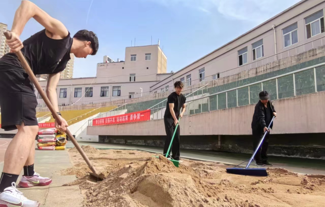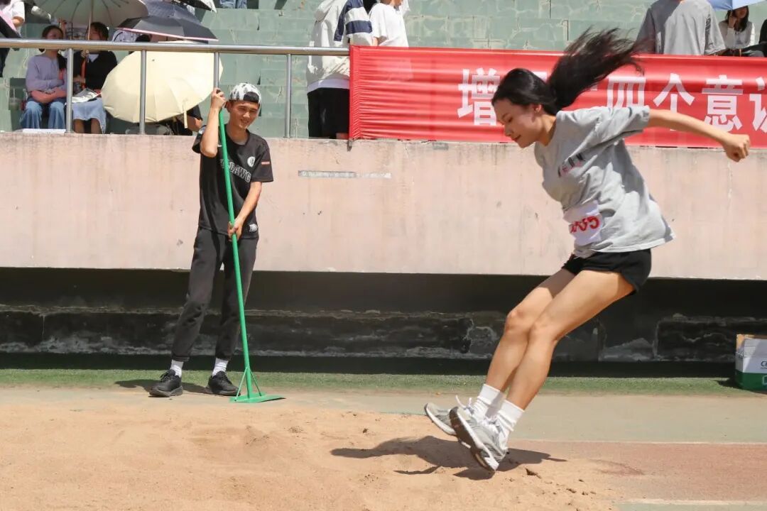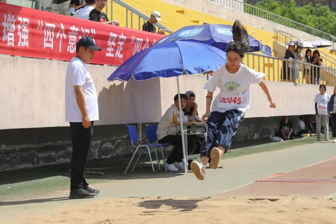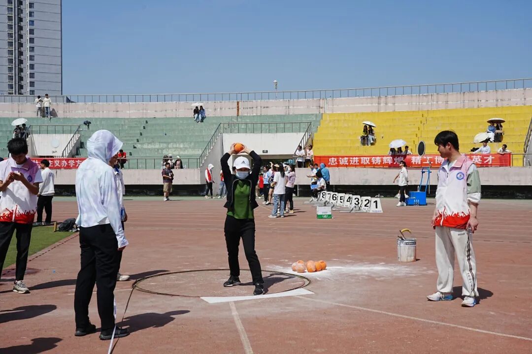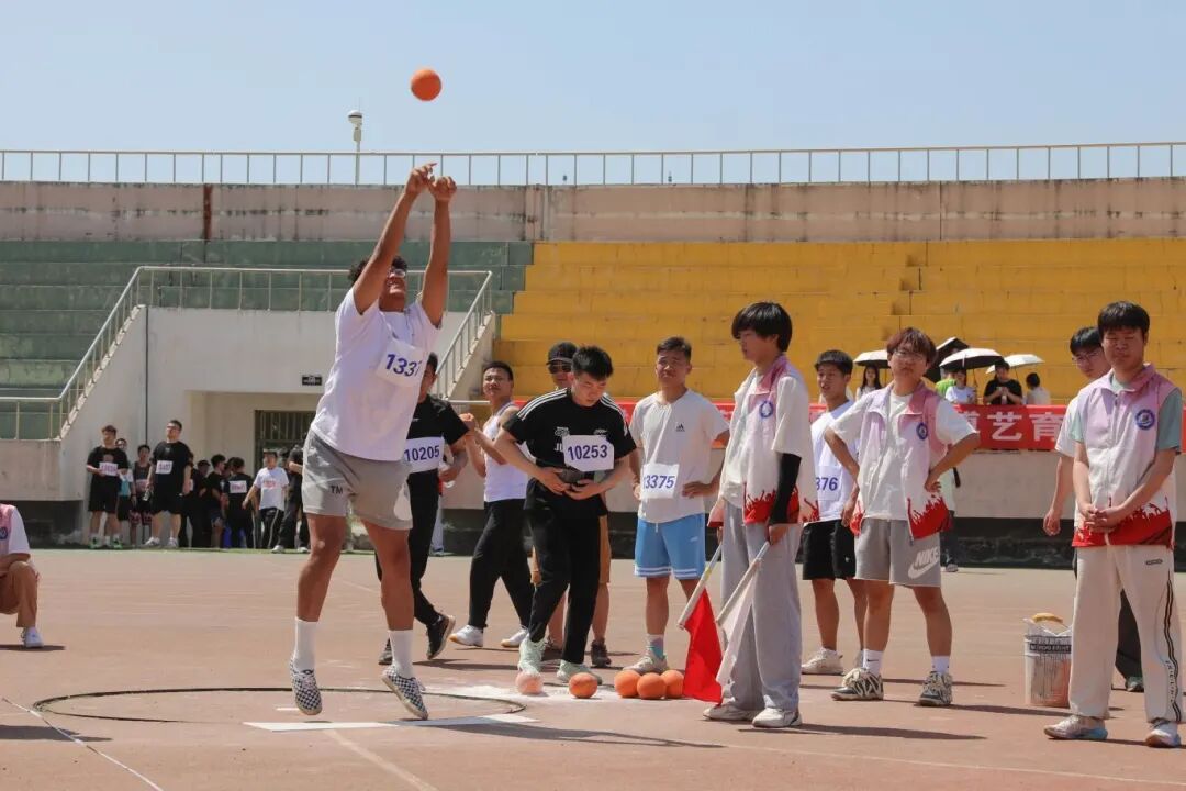 基础学院王振坤(图中右二)在男子乙组实心球项目中,以17.20米的成绩打破校纪录16.62米。