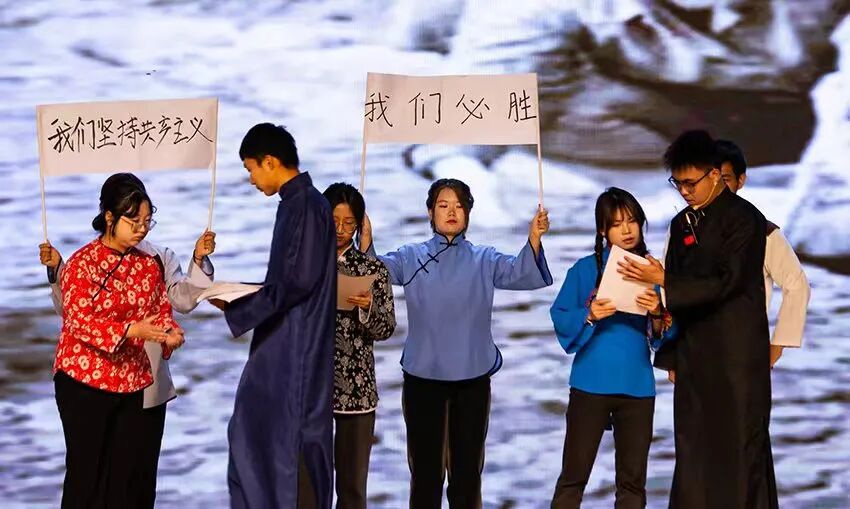 比赛现场高潮迭起、精彩不断。“竹签子是竹子做的,共产党员的意志是钢铁!”赵薇、张莉等同学以情景再现的方式演绎了江竹筠烈士被关押在渣滓洞集中营惨遭酷刑却仍不屈服的感人故事,生动诠释了红岩精神的时代内涵,引发了现场观众的情感共鸣。张曦月、蒋雯旭等同学将左权将军与妻子刘志兰的故事分为相知、相爱、家国、离别四部分进行讲述。跌宕起伏的剧情、生死离别的场景、将观众们带回那段战火纷飞、硝烟弥漫的抗战岁月。宋泉彤、王钰龙等同学分享了长津湖战役中战士们在极端恶劣环境中坚守阵地,以钢铁般的意志捍卫和平的英勇事迹。