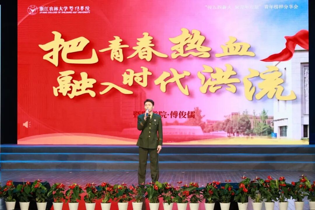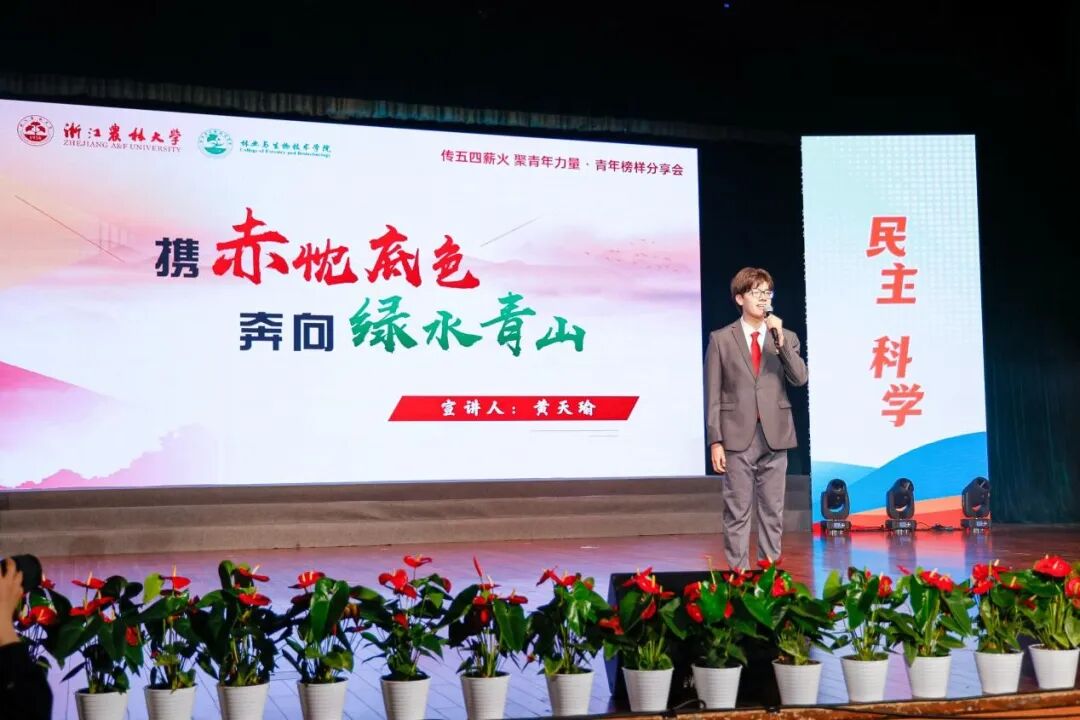 第十三届全国梁希优秀学子奖、校第八届红绿标兵提名奖获得者黄天瑜同学,第十八届“挑战杯”全国大学生课外学术科技作品竞赛黑科技专项赛特等奖获得者潘心怡同学,考取复旦大学药学专业硕士的王腾斐同学,2021年中国大学生自强之星获得者赵吟吟同学,中国大学生游泳锦标赛女子甲组200仰泳第三名获得者李静毓同学,浙江省大学生艺术节民乐合奏二等奖获得者苏菲雨同学,退伍于武警江苏总队无锡支队的傅俊儒同学,校雷锋班班长、被推荐2022年“万朵鲜花送雷锋活动”身边的活雷锋吉彦霖同学,全国大学生暑期社会实践“千校千项”优秀项目负责人、浙江省暑期社会实践调研报告一等奖获得者李建勋同学,杭州亚运会火炬传递丽水站第165棒火炬手、杭州亚运会亚残运会浙江省先进个人吴素青同学等10名青年榜样代表分享了青春成长故事。