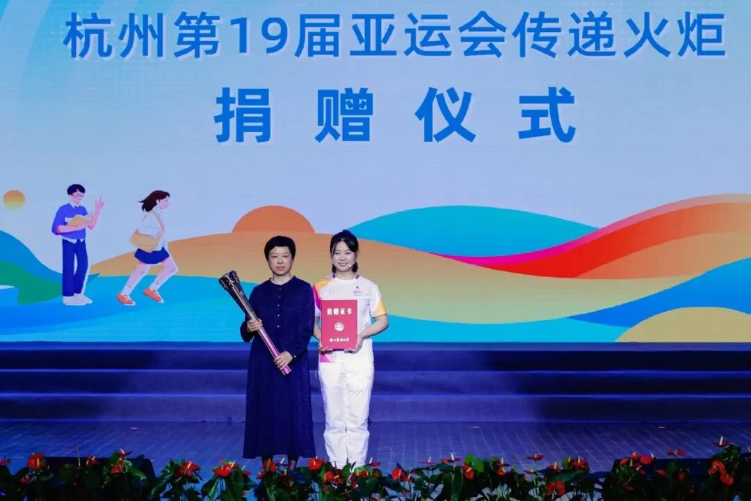 现场还举行了杭州第19届亚运会火炬捐赠仪式。杭州亚运会火炬传递丽水站第165棒火炬手、我校城乡规划专业2020级学生吴素青捐赠亚运火炬。校党委副书记施美红代表学校接受捐赠,并为吴素青颁发捐赠证书。