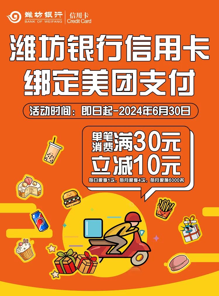 潍坊银行信用卡持卡人在美团App绑定美团支付。订单支付时,支付方式选择潍坊银行信用卡,享单笔消费30元以上立减10元。
